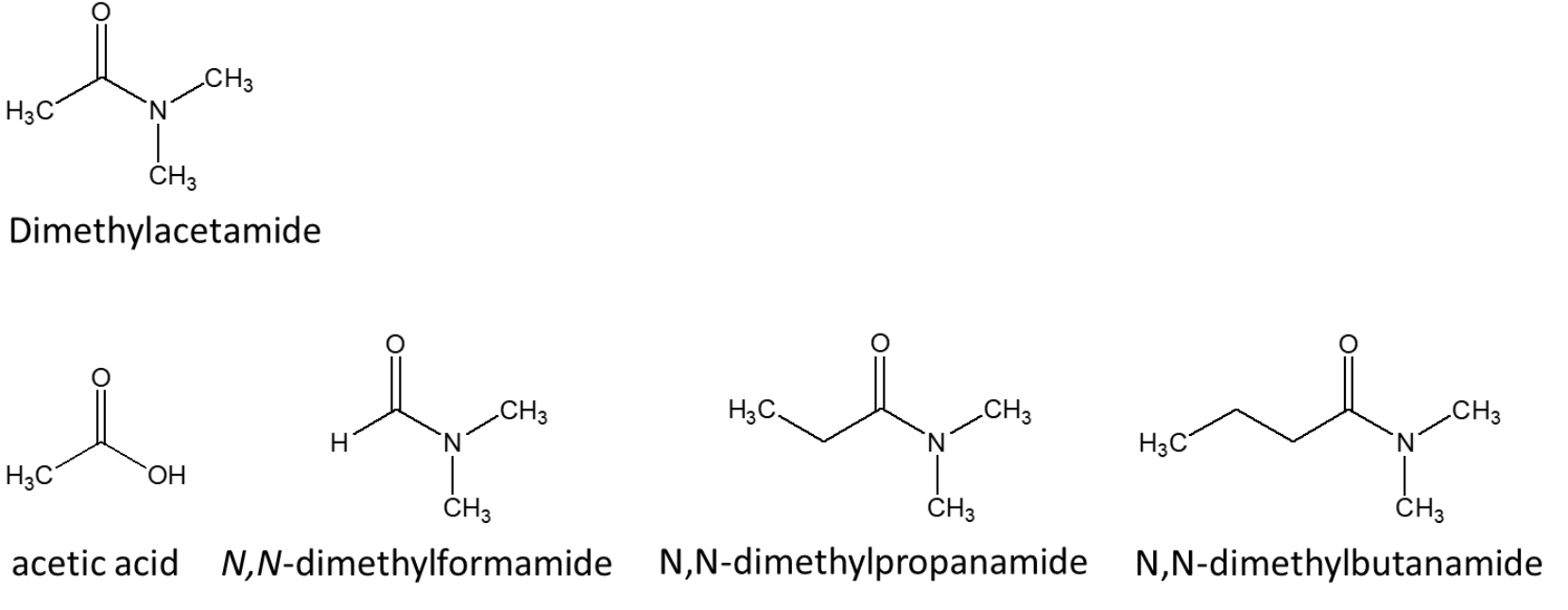 二甲基乙酰胺((Dimethylacetamide,全称:N,N-二甲基乙酰胺,缩写DMA,化学式:CH3C(O)N(CH3)2),分子量为87.12 g/mol [1],为无色透明液体,有刺鼻气味,能与水、醇、醚、酯、苯、三氯甲烷和芳香化合物等有机溶剂任意混合,且能使化合物分子活化,常用作非质子极性溶剂。1883年由德国化学家Carl Schotten和Eugen Baumann发现并首先报道了酰卤和胺作用可以快速简便地合成酰胺[2],而乙酰氯法是基于Schotten-Baumann反应开发出来,其原料为乙酰氯和二甲胺,其中乙酰氯为酰化剂,生产二甲基乙酰胺。DMA具有热稳定性好、溶解性强以及化学性质稳定等特性,广泛用作溶剂及催化剂,在生物医药、化工合成、材料纺丝等领域有广泛的应用。
