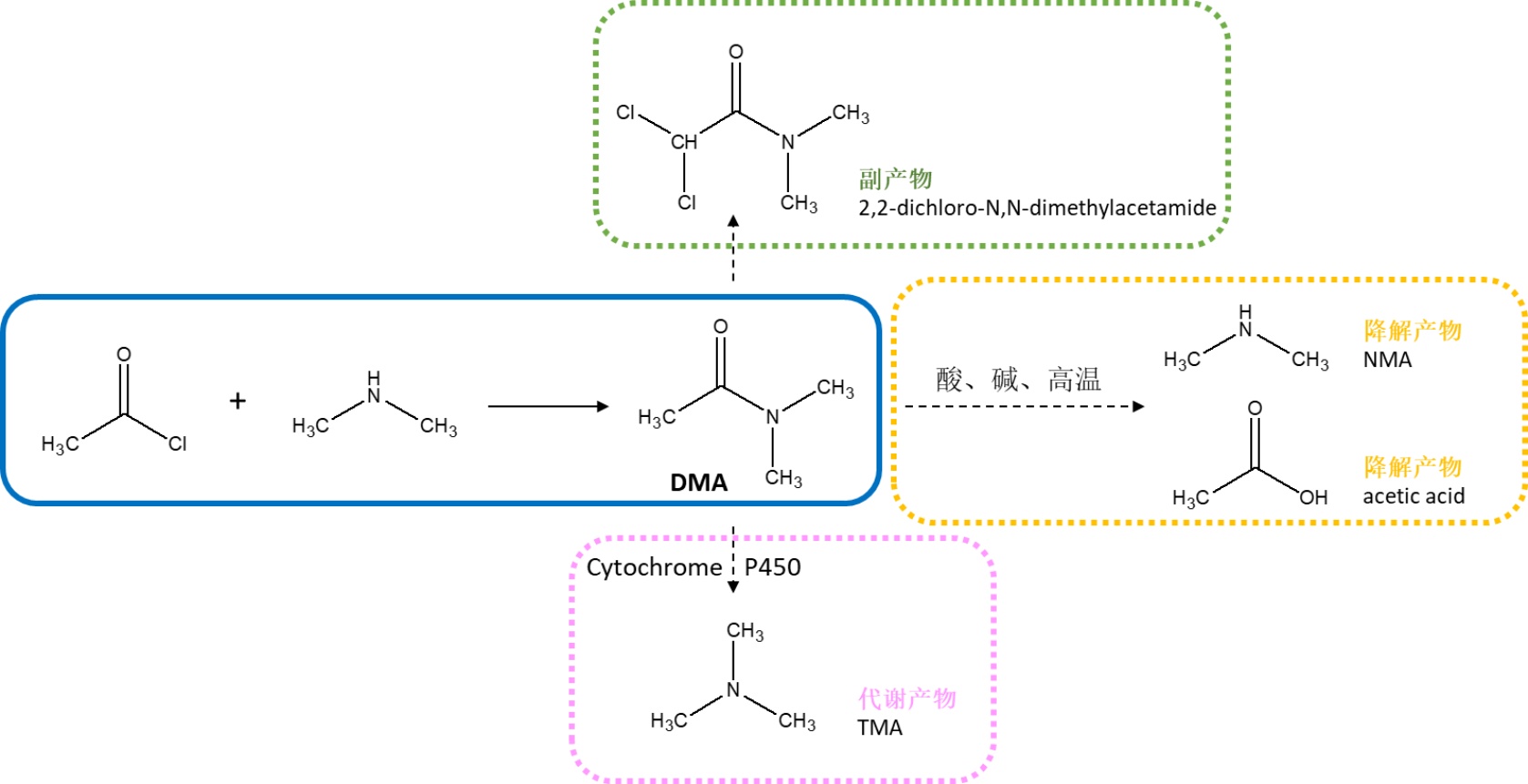 《欧洲药典》(EP11.0)规定了DMA的有关物质(见图1),其主要来源包括生产与应用过程中可能引入的杂质包括合成原料残留物(如:醋酸、二甲胺)、反应副产物(如:2,2-二氯-N,N-二甲基乙酰胺),以及降解产物N-甲基乙酰胺(NMA)等(见图2),这类杂质会影响产品性能并带来安全风险,其限值标准将得到进一步明确。胡南[17]借助特殊精馏技术把DMA-水体系分离出来,解决了DMA和醋酸的高效分离。刘丹丹等人[18]运用LC-MS法对艾瑞昔布中2,2-二氯-N,N-二甲基乙酰胺的含量进行了测定,该方法的检出限较低,选择性强,给医药领域DMA相关杂质的控制提供了检测依据,也促使医药级DMA杂质限值标准得以完善。近些年来,对DMA杂质控制的维度进一步拓展,Le Bras在研究中发现,DMA作为反应试剂时会产生NMA等副产物。Nomiyama等人[5]经流行病学调查和毒理学实验,证实了DMA长期暴露会使肝脏损伤风险明显增加,且其代谢产物NMA在体内蓄积有协同毒性,建议在质量标准里增加该产物的残留控制要求,给杂质限值的科学设定提供了毒理学依据。