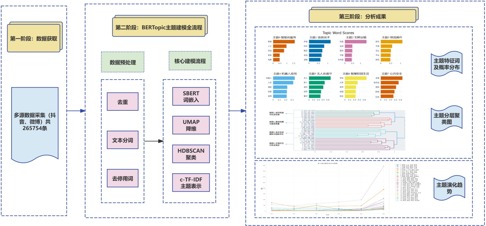 基于此,为进一步探究新质生产力视域下的技术扩散规律,本研究整合抖音与微博平台评论数据,采用基于Transformer的BERTopic动态主题模型,解构公众关注的核心主题特征及演化趋势,进而揭示无人配送应用场景的多元化格局及其演进路径。研究结论将为技术范式迭代、商业场景拓扑及产业政策优化提供数据驱动的实证支撑,从而驱动人工智能与现代物流产业的深度融合与高质量发展。