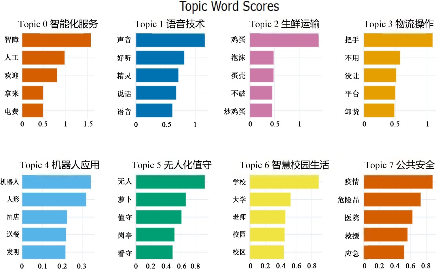Topic 4“机器人应用”:该主题涵盖了“机器人”、“人形”、“酒店”、“送餐”等词。其中最高权重词“机器人”仅为0.34,最低词“发明”为0.22。该组关键词权重普遍较低且分布平均,说明机器人应用这一主题涉及的概念较为宽泛,主要指向酒店、餐厅等室内的商业服务应用场景。