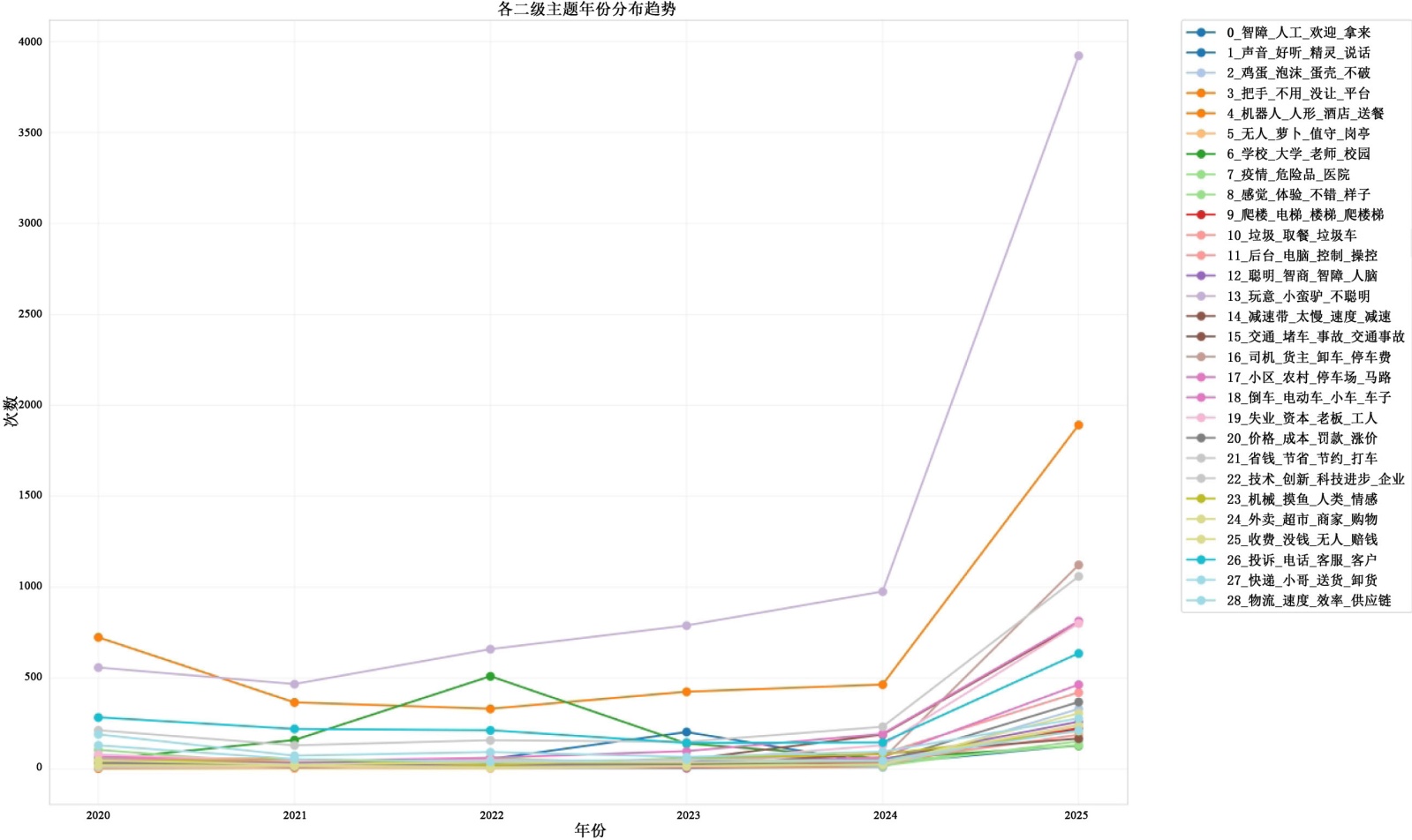 第四,2024年至2025年:新质生产力驱动下的全面爆发期。在2024年以后,行业关注度突破临界点,迎来高速增长。从图4的演化轨迹来看,除“7_公共安全”回升幅度有限外,其他核心主题均进入快速上升通道。尤为引人注目的是,“13_智能化欠缺”呈现指数级增长,跃升为当前舆论场的绝对焦点;与此同时,“3_物流操作”、“5_无人化值守”及“26_服务客诉”也随之大幅攀升。这种普遍且剧烈的上涨趋势,实则是新质生产力战略宏观指引与市场规模化应用微观驱动双重作用的结果。一方面,政策层面的战略升级重塑了技术期待。2024年,“人工智能+”行动被写入政府工作报告,国家大力推动具身智能(Embodied AI)与人形机器人的发展,将无人配送装备视为发展新质生产力的重要载体。这一顶层设计极大地提高了社会公众对无人设备的认知标准,使得舆论焦点从早期的车辆外观或新奇感迅速聚焦于核心的智力水平。另一方面,市场层面的规模化落地激发了现实需求。随着京东、美团及第三方快递企业在城市末端的大规模铺设,无人配送已从实验性科技转变为高频使用的日常基础设施。规模化的应用必然带来长尾场景的复杂性,导致用户对服务是否及时、售后是否完善提出了严苛要求。这表明,行业的主要矛盾已发生根本性转移:从解决能不能送的可行性问题,升级为解决送得好不好与够不够智能的体验与质量问题。