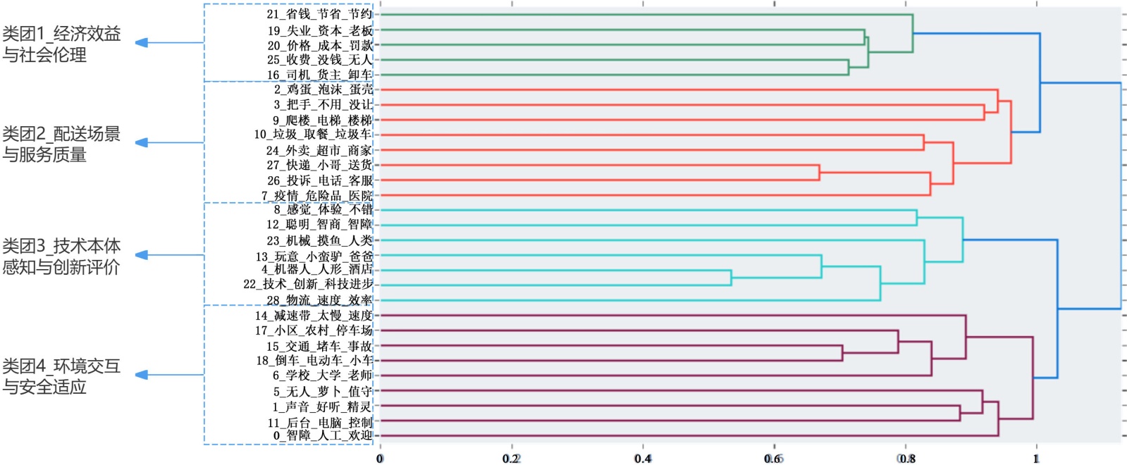 本文基于BERTopic主题模型挖掘抖音和新浪微博平台关于无人配送的公众评论,得出以下主要结论:首先,用户对无人配送技术的关注点呈现多元化特征。通过主题建模识别出的核心主题涵盖“语音技术”、“生鲜运输”、“物流操作”、“机器人应用”、“无人化值守”、“智慧校园生活”、“公共安全”及“智能化服务”等多个维度,反映出无人配送技术在不同应用场景中的用户体验与社会影响。通过层次聚类进一步归纳,这些主题可系统性地整合为四大研究方向:经济效益与社会伦理、配送场景与服务质量、技术本体感知与创新评价以及环境交互与安全适应。这表明公众的认知结构已超越单纯的技术猎奇,形成了包含经济博弈、服务实效与安全伦理在内的立体化评价体系。