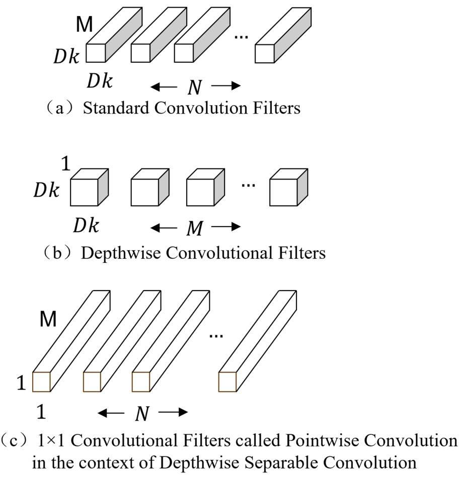 Figure 3. The standard convolutional filters in (a) are replaced by two layers: depthwise convolution in (b) and pointwise convolution in (c) to build a depthwise separable filter