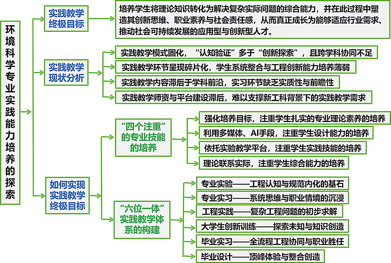 实践教学实验课、课程设计、实习等环节往往彼此割裂,分别侧重于孤立技能点(如化学分析、生态采样)。缺乏覆盖“问题识别–监测溯源–模拟评估–解决方案设计–管理决策”全链条的综合性、项目制实践,学生系统思维和解决复杂环境问题的能力培养不足。各主要实践教学环节的教学知识重点各有不同,但主要实践教学内容之间缺少关联,相互脱节,不利于学生对实践教学知识的系统学习,不利于学生解决复杂环境工程问题的培养,从而导致对学生工程实践和创新能力培养不足。