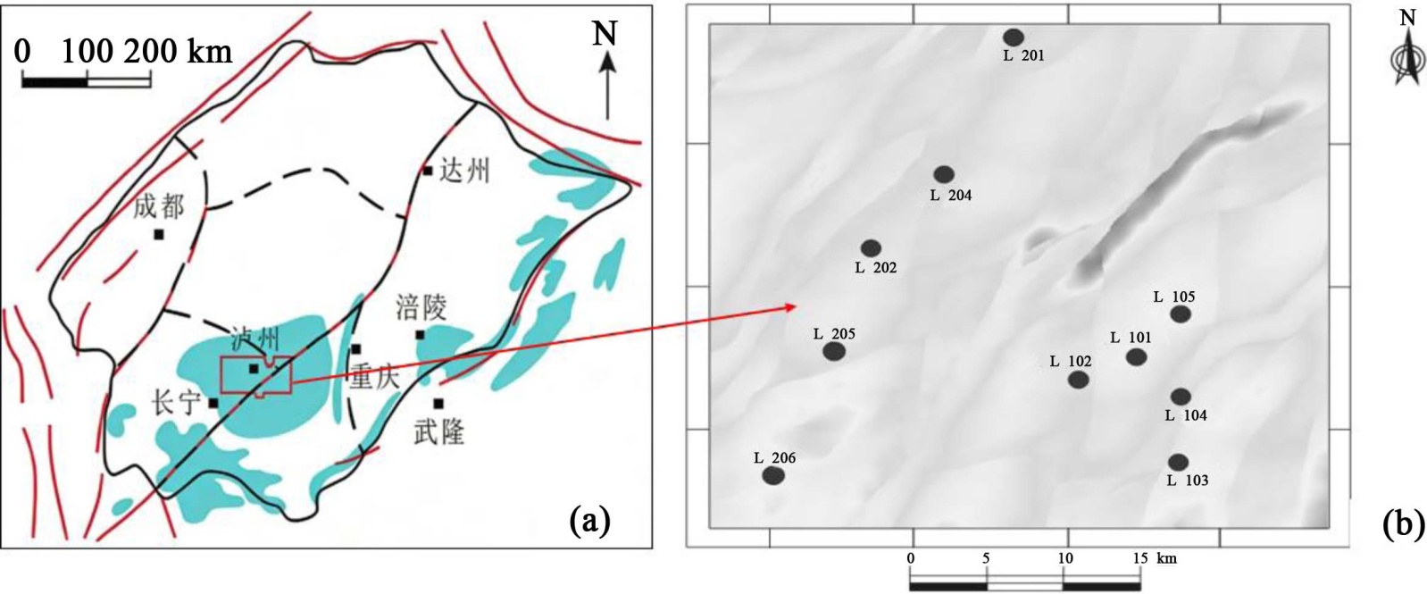 图1. 川南盆地构造[4] (a)和井位分布图(b)