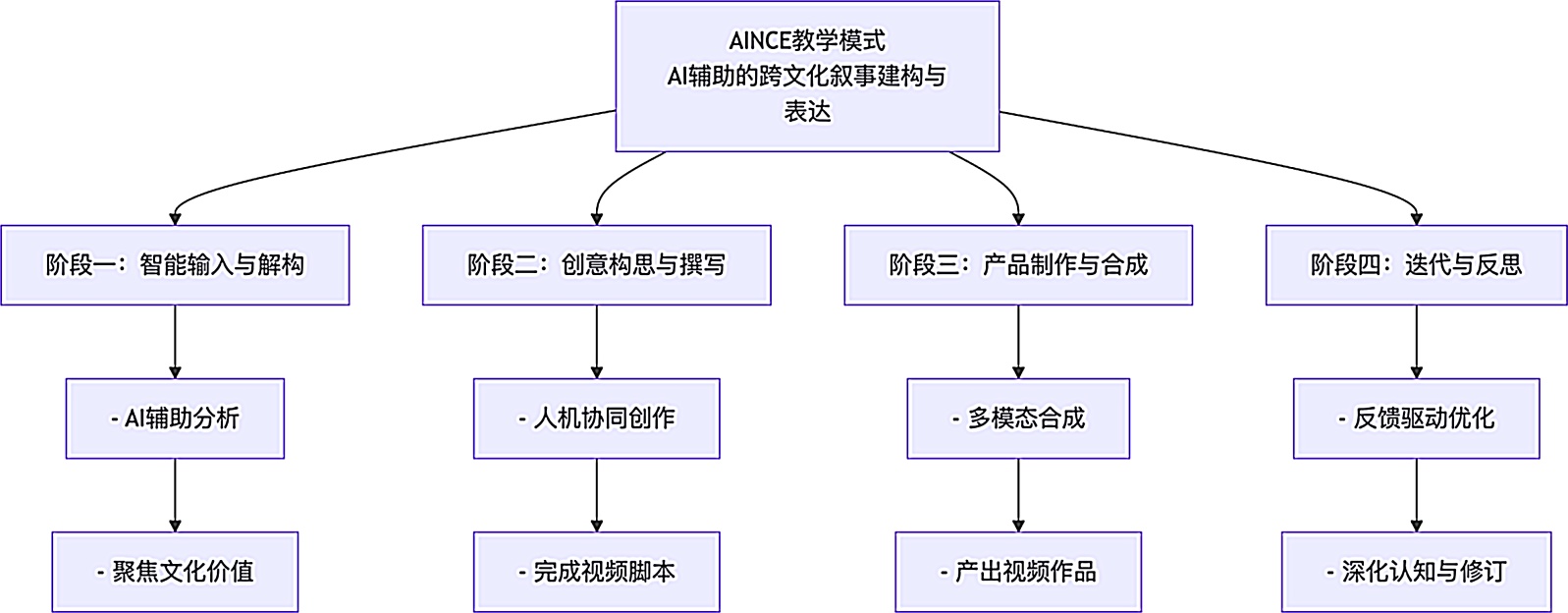 本研究构建了“AI辅助的跨文化叙事建构与表达(AI-facilitated Intercultural Narrative Construction and Expression, AINCE)”教学模型,该模型通过“叙事建构与表达”强调学生需完成从主题提炼、视角选择、意义组织到修辞适配的创造性意义生产与外化呈现,以“跨文化”为叙事活动的目标语境与核心挑战,以AI技术为贯穿始终的赋能工具,以多模态产品(Production)为产出导向,展示了引导学生主动将中华优秀文化知识转化为面向国际受众的、富有说服力与共鸣感的叙事作品(如微视频)的系统性过程。该模型包含四个阶段循环(见图1)。