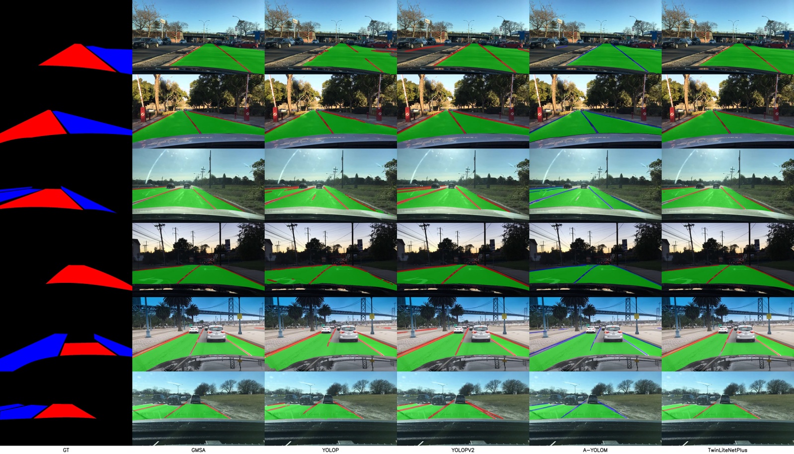 夜间场景下的分割结果如图7所示,从左至右依次为真值(GT)、GMSA、YOLOP、YOLOPv2、A-YOLOM以及TwinLiteNetPlus。受光照不足等干扰影响,图像对比度与可用纹理信息明显降低,对模型的鲁棒性提出了更高要求。在该场景中,YOLOP表现不稳定,车道线易出现断裂或模糊;YOLOPv2在整体效果上较优,但仍存在重复检测和虚假响应的问题;A-YOLOM与TwinLiteNetPlus虽能保持车道线的基本完整性,但在局部区域易出现模糊或粘连现象。相比之下,GMSA模型在低光照条件下仍能较为准确地分割车道线与可行驶区域,预测结果清晰,表现出更好的夜间适应性。