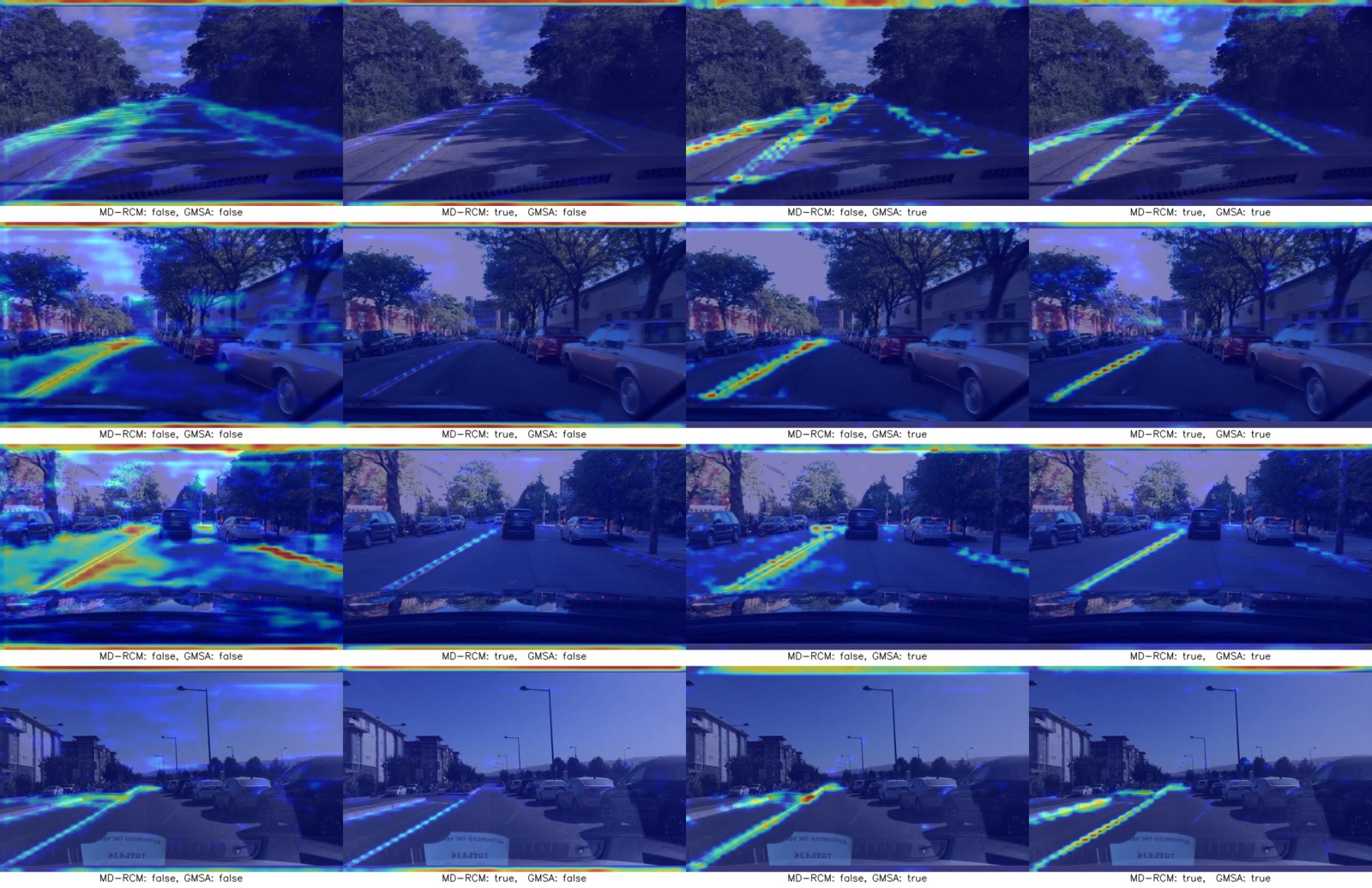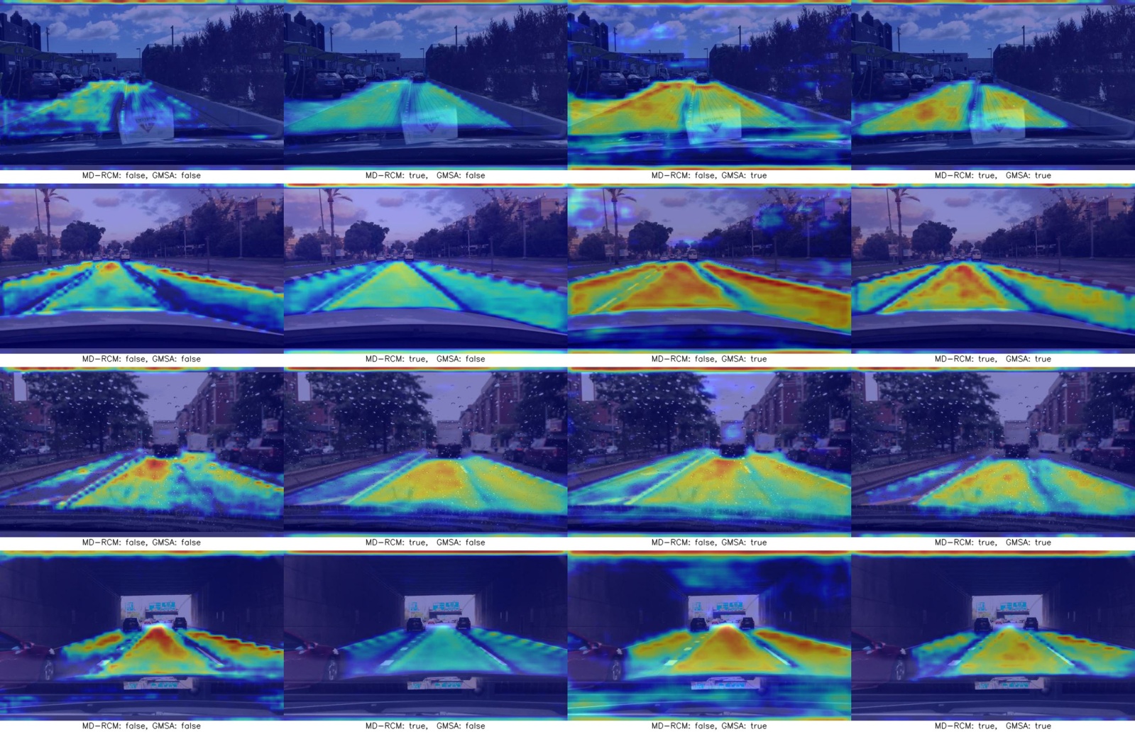 本研究采用Grad-CAM [31]方法对模型在可行驶区域检测与车道线检测两个子任务中的激活特征图进行可视化处理,生成代表模型对不同区域关注程度的热力图,分析不同结构模块对模型感知能力的影响。分析了不同的模型结构,包括“无模块”“仅使用MD-RCM”“仅使用GMSA”“两者同时使用”四种,在不同场景下对热力图进行定性分析,以评估各模块对模型效果的影响。