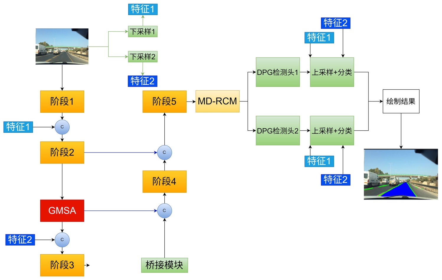 GMSANet模型采用编码–增强–解码的结构,整体由共享编码器、MD-RCM增强模块以及分别用于可行驶区域检测与车道线检测的两个解码器分支组成。模型的整体结果如图1所示。