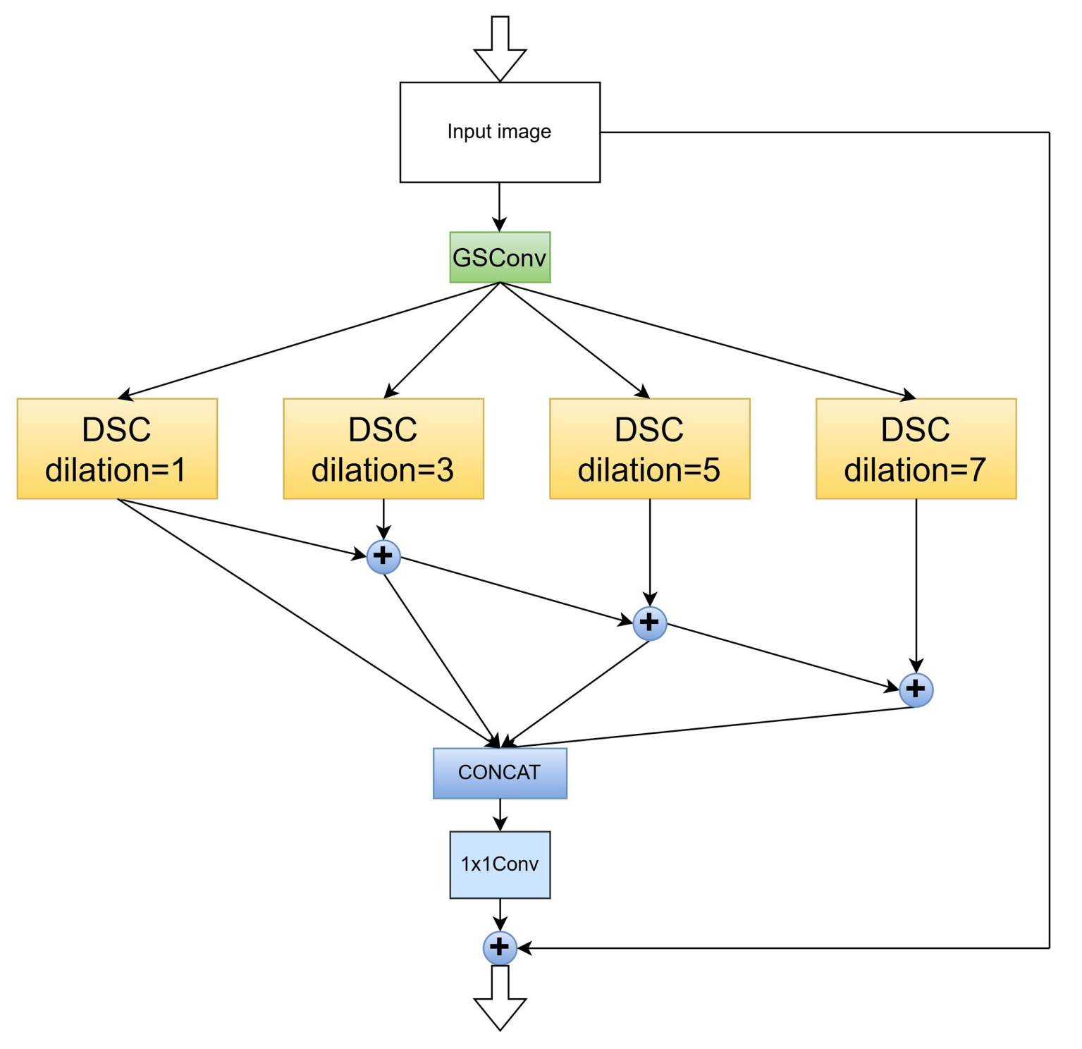 “降维–深度卷积–通道混合”的组合结构在不显著增加计算量与参数量的前提下,保留了通道之间的联系,增强了特征的多样性。不过,若在多尺度分支部分中继续使用GSConv,会导致网络参数量和推理延迟大幅上升。因此,GSESP模块仅在降维阶段采用GSConv压缩高维输入并提升特征提取能力。