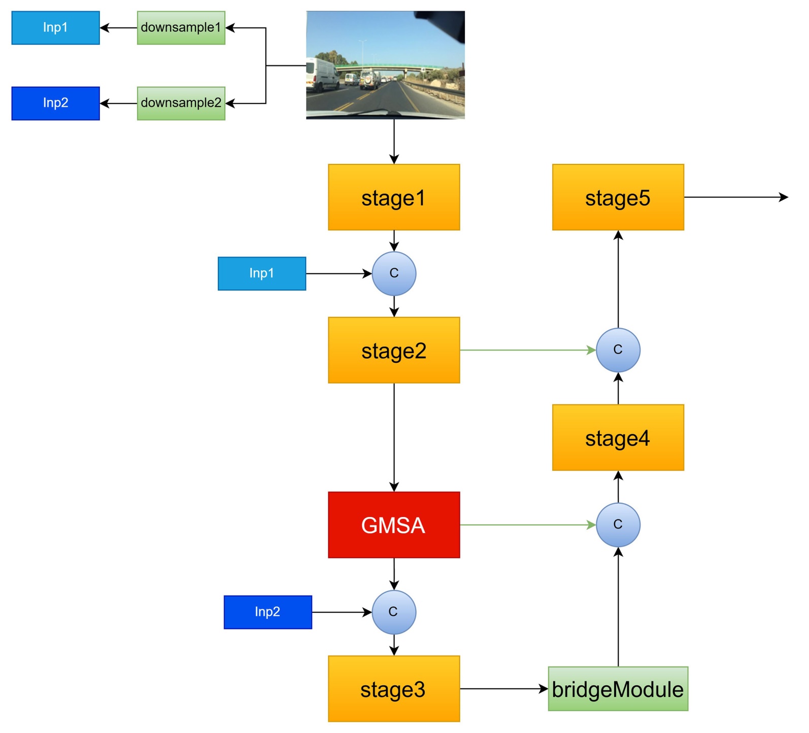 网络的编码器由不同的stage组成,每个stage内部包含若干个GSESP模块。通过下采样与通道增强,逐步提升语义表达能力。多尺度建模与注意力机制更进一步强化了特征的感知,为后续分支任务提供的特征基础。编码器整体架构如图3所示。