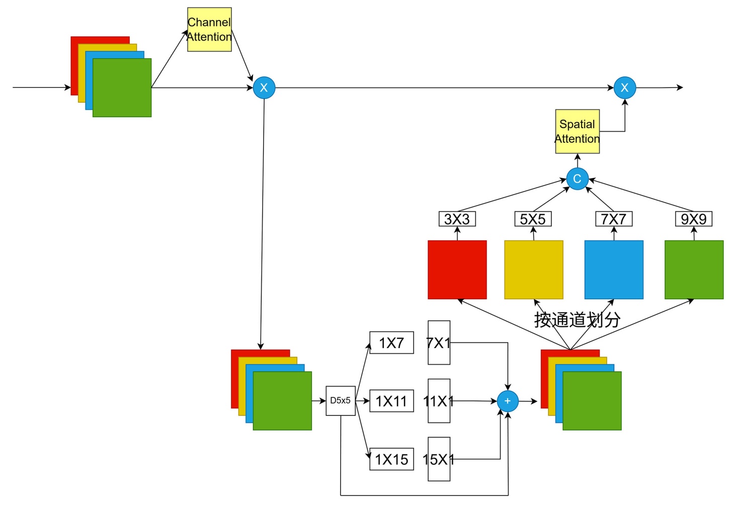 ,并分别通过不同尺度的Depthwise Separable卷积(1 × 1、3 × 3、5 × 5、7 × 7)进行局部上下文建模,以进一步提取不同感受野下的空间信息。分组策略一方面能够降低卷积计算量,另一方面在不同特征子空间内实现方向性特征的独立建模,避免通道间特征干扰。模块在保持轻量化的同时进一步提升了特征的多样性与表达能力。