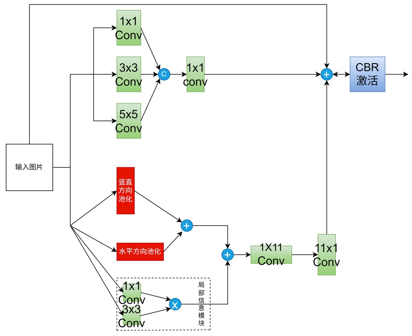 为了进一步突出关键区域的响应,该机制采用两个方向性卷积(横向1 × 11与纵向11 × 1),模拟图像中常见的矩形区域感知方式,从而提取更符合前景结构的注意力权重图。