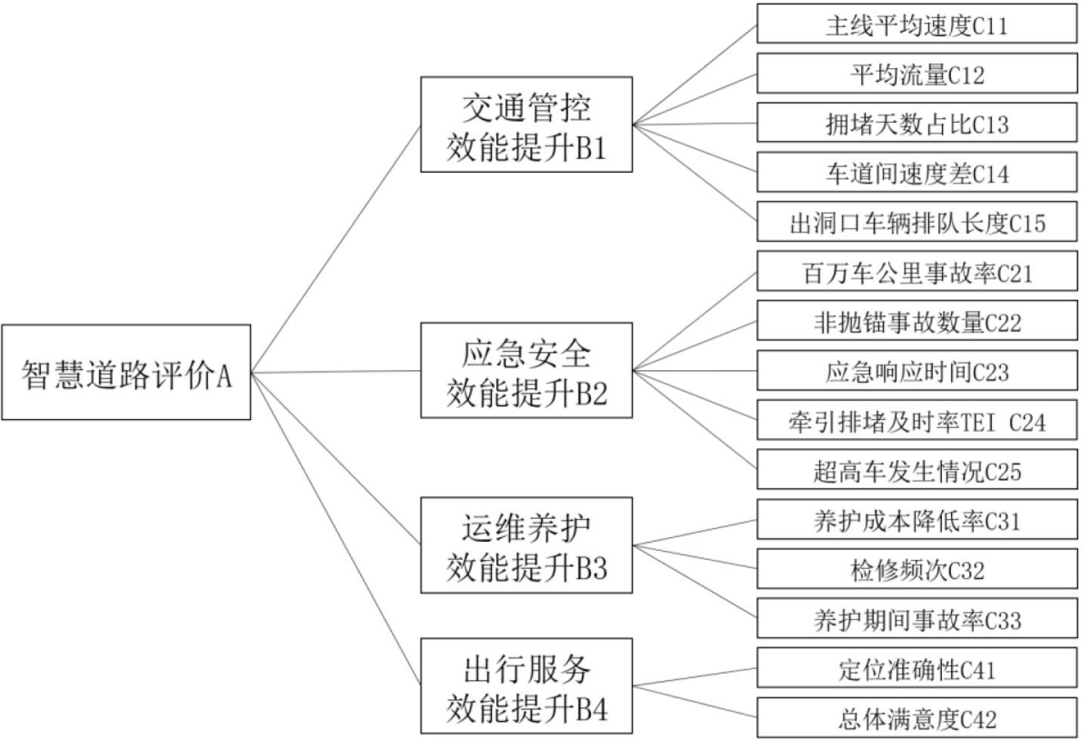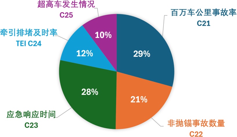 针对“应急安全效能提升”一级指标,设置了百万车公里事故率(C21)、非抛锚事故数量(C22)、应急响应时间(C23)、牵引排堵及时率TEI (C24)和超高车发生情况(C25)二级指标。这些指标旨在评估道路在应急情况下的安全性能和响应能力。