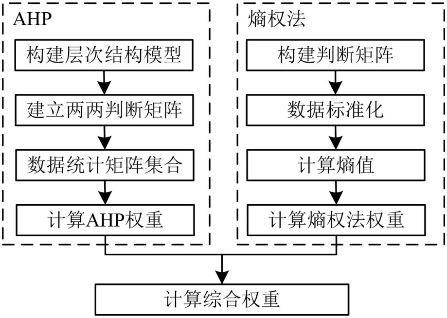 传统的权重确定方法主要分为主观赋权和客观赋权两大类。主观赋权方法,如层次分析法(AHP),依赖于专家的经验和判断,虽然能够体现决策者的偏好和主观评价,但容易受到个人主观性的影响。而客观赋权方法,如熵值法,主要依据数据自身的分布特性来确定权重,虽然能够减少主观判断的偏差,但可能忽视了专家的专业知识和经验。因而,本文采用如图3所示的主客观综合的方法,综合层次分析法和熵值法的组合赋权法,以期达到权重确定的科学性和合理性。计算公式为: