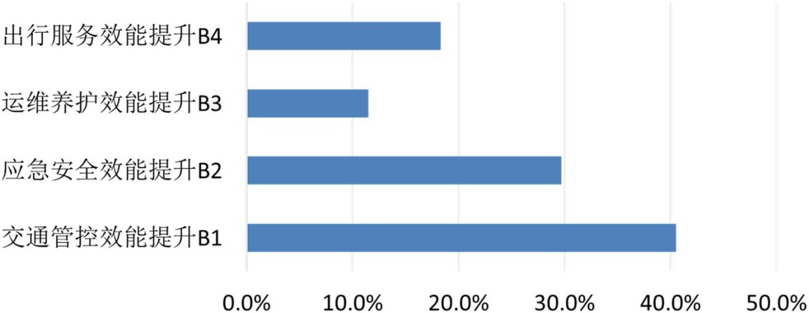 二级指标权重如图4所示。交通管控效能提升B1权重超过40%,表明在智慧城市道路效果评价中,交通管控效能被认为是最关键的因素,因为它直接影响到交通流畅性、安全性和道路使用效率。应急安全效能提升B2的权重约为30%,是第二重要的指标。这强调了在智慧城市中,应急响应和安全措施的重要性,尤其是在处理突发事件和保障道路使用者安全方面。出行服务效能提升B4权重约为20%,反映了提供高质量出行服务的需求,包括路线规划、信息服务等,对于提升智慧城市道路的整体效能至关重要。运维养护效能提升B3权重最低约为15%。尽管相对较低,但运维养护效能仍然是智慧城市道路不可或缺的一部分,它涉及到道路维护、设施更新等,对于保持道路长期稳定运行和性能至关重要。