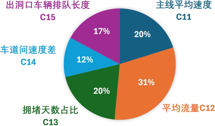 针对“交通管控效能提升”二级指标,设计了包括主线平均速度(C11)、平均流量(C12)、拥堵天数占比(C13)、车道间速度差(C14)以及出洞口车辆排队长度(C15)二级指标。这些指标主要关注交通流的顺畅度和效率。