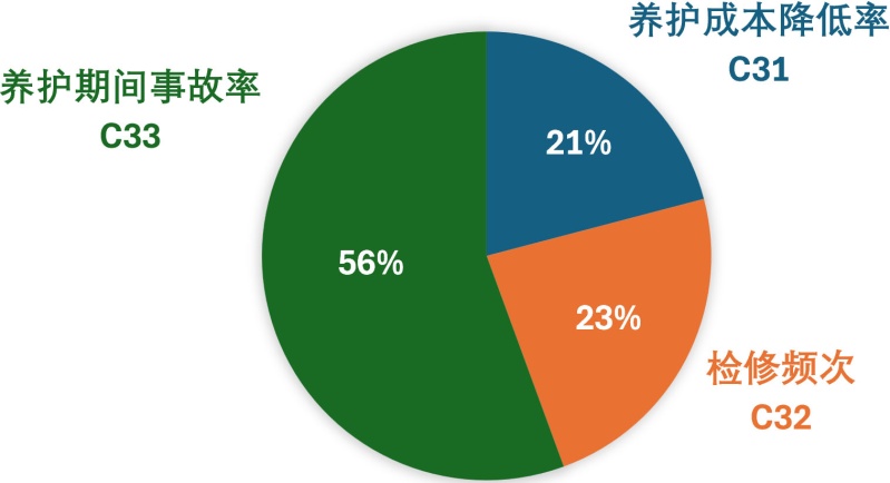 针对“运维养护效能提升”一级指标,提出了养护成本降低率(C31)、检修频次(C32)和养护期间事故率(C33)二级指标。这些指标主要关注道路设施的日常维护和养护效率,通过降低养护成本、合理安排检修频次和减少养护期间的事故发生,来提高道路的运维养护效能。