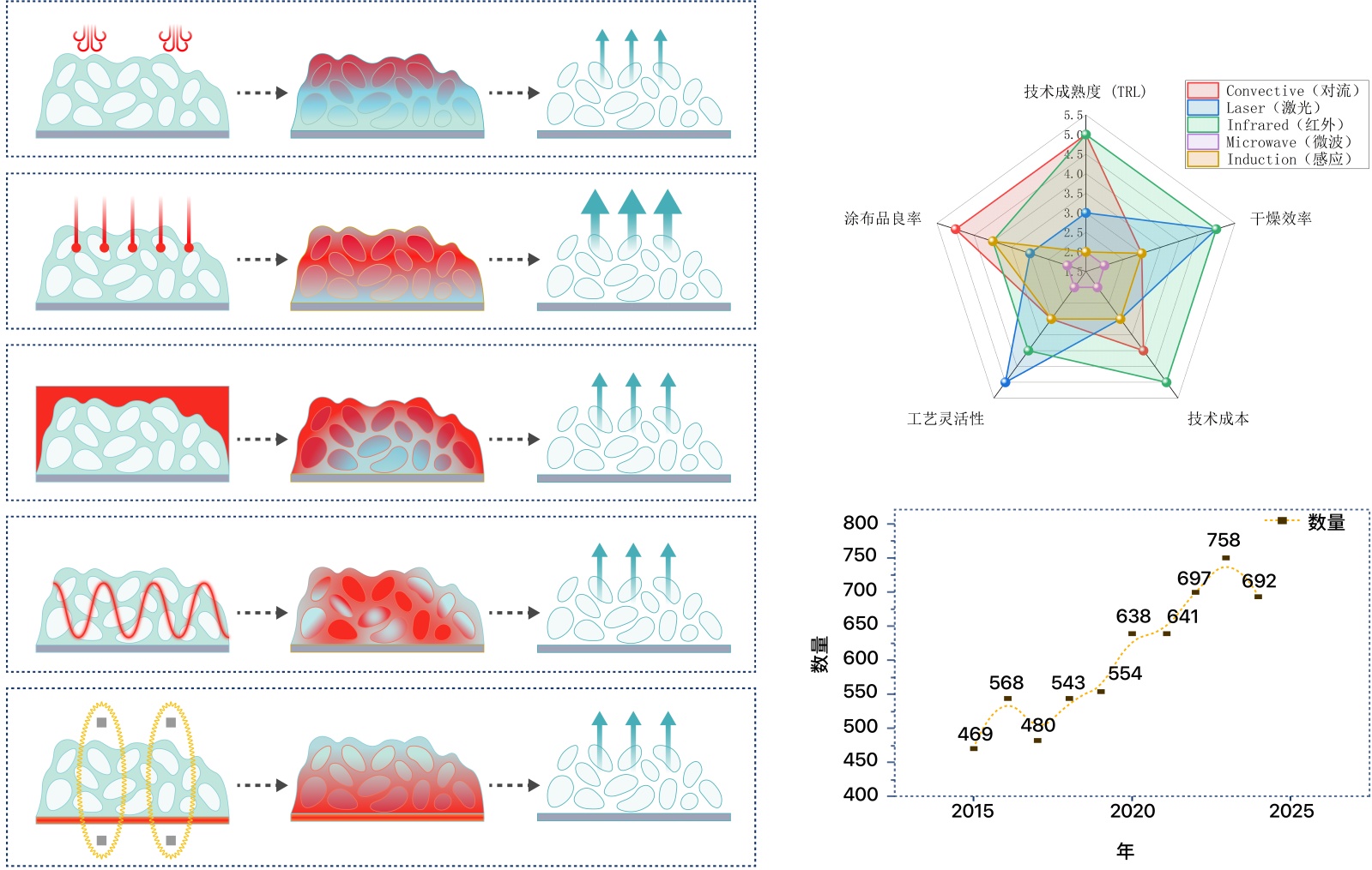 如图1所示,不同干燥技术在能量输入位置、能量传播路径及溶剂迁移行为方面存在一定差异。传统的工业干燥方式主要还是以热对流(热风)、辐射(红外)和微波等为主。热对流干燥技术成熟、适用性广,但这种干燥方式存在热惯性大、总体加热效率低以及在厚度或导热性不均的湿膜存在显著的温度梯度的缺点,并且表面先干、内部后干的“表层硬壳化”、孔隙滞留和应力集中等问题时有发生;红外或微波虽能在一定条件下提高局部能量输入效率,但在均匀性、可控性和对薄膜微结构调控方面仍存在局限[2] [4]。随着对节能减排与高产能制造的要求日益提高,传统干燥方式在能效(单位蒸发能耗)和生产节拍上的短板愈发突出,促使研究者寻求更加高效、可控的干燥手段[5] [6]。相比之下,激光辅助干燥在空间与时间尺度上的能量可控性更强,在干燥效率与工艺灵活性方面展现出潜在优势。近五年的文献统计结果进一步表明,高效与强化型涂布干燥技术正成为研究热点。