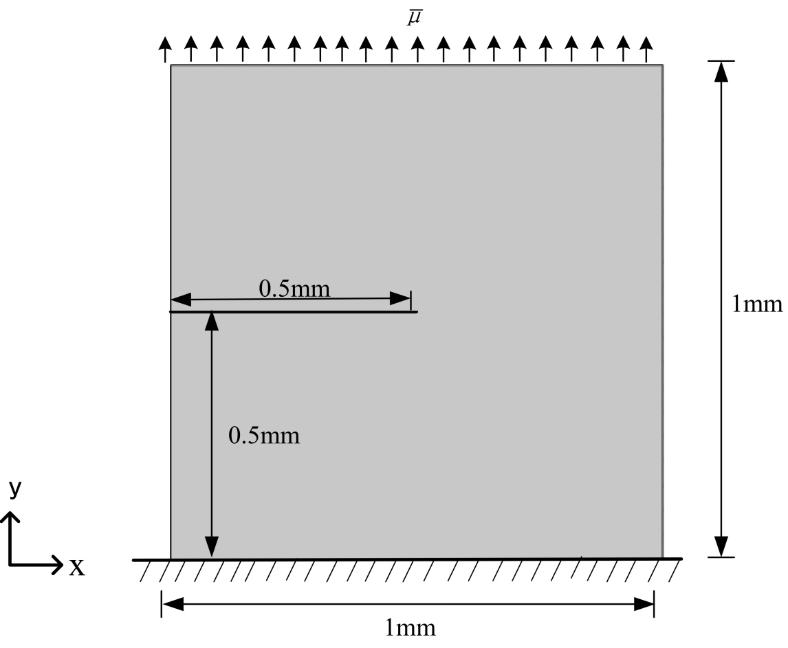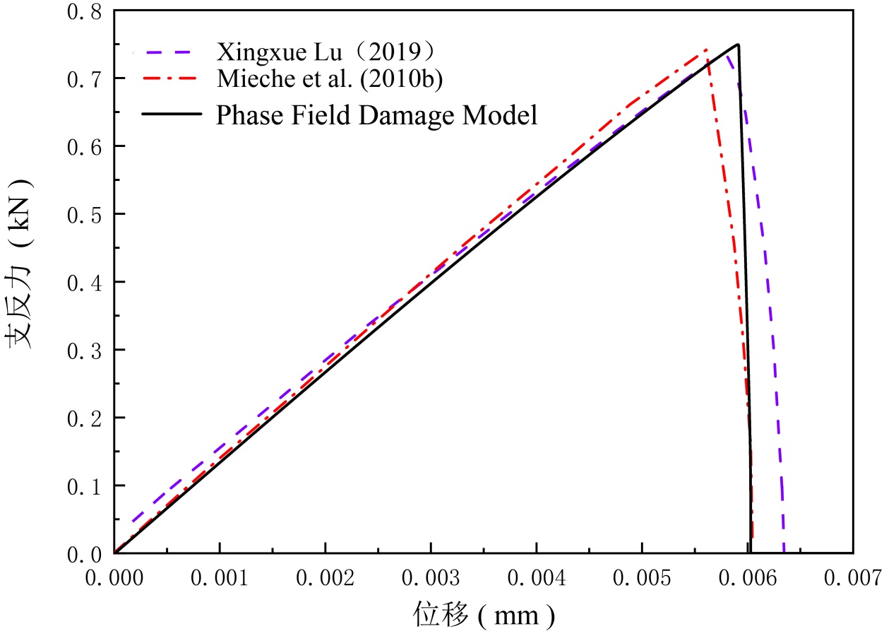 本小节采用ABAQUS软件的UEL子程序对含初始损伤的纯弹性材料进行裂纹扩展分析。在ABAQUS中设定的边界条件如图2所示,方形平板底部边界沿x、y方向的位移被固定,位移步长Δu设为1 × 10−7 mm。材料弹性模量E = 210 GPa,泊松比ν = 0.3,长度尺度参数ac = 0.0075 mm,临界能量释放率Gc = 2.7 N/m。节点力的计算结果如图3所示,与Miehe [23]和Xingxue Lu [24]等人在类似模型中获得的结果一致。考虑到初始损伤的存在,节点处的应力值较Miehe [23]和Xingxue Lu [24]等人的计算结果更高,这与损伤力学的基本原理相吻合。