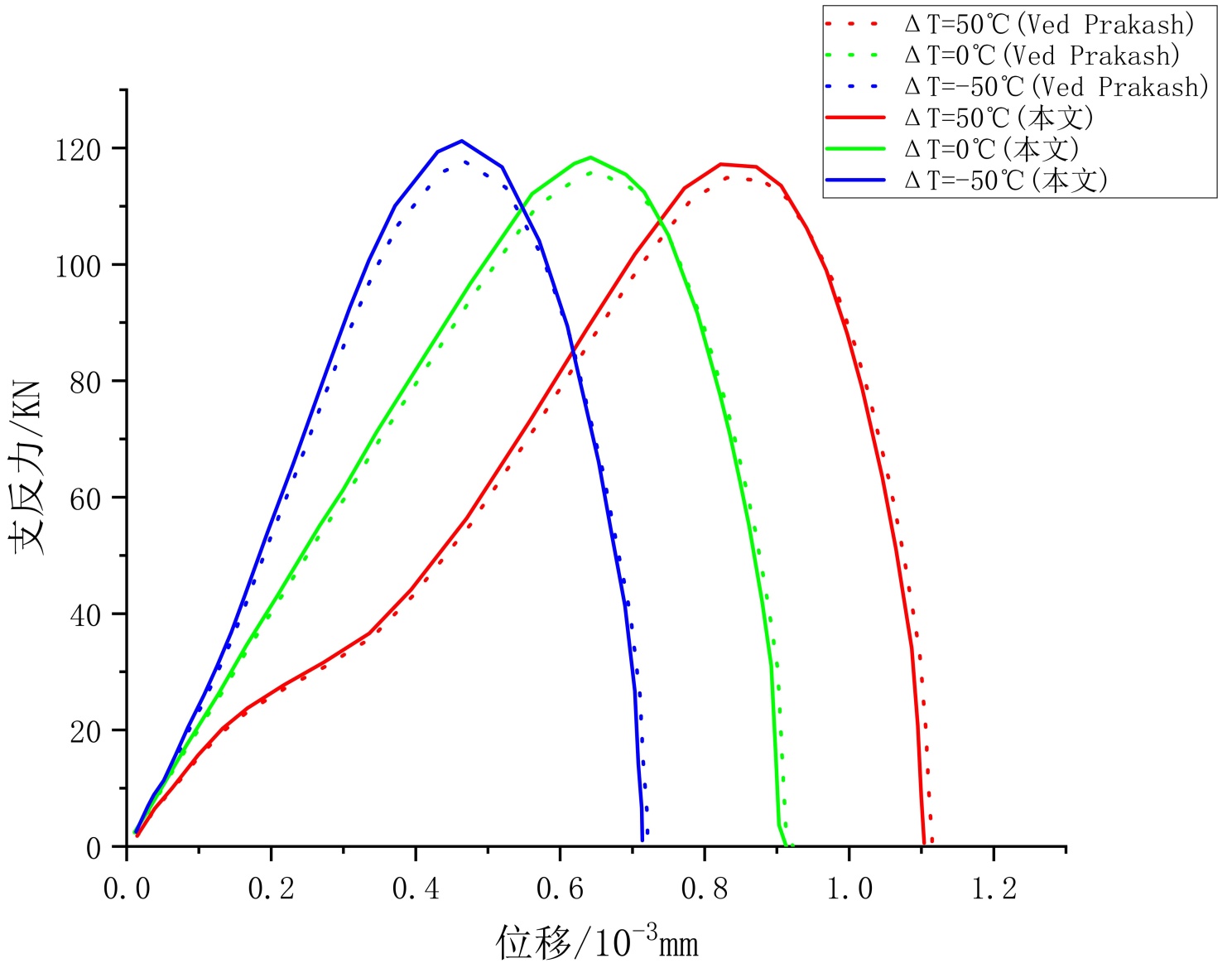 图8. 展示了单边缺口试样在不同温度作用下的位移–支反力曲线