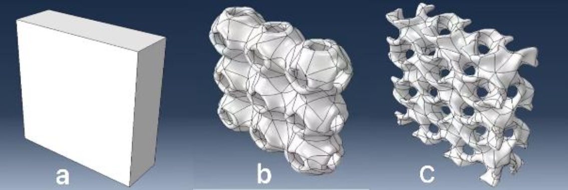 本研究成功构建所需的三周期极小曲面(TPMS)模型。通过对现有文献的系统调研[1] [3],筛选出Schwartz (图1(b))、Gyroid (图1(c))两种典型的TPMS结构与普通结构(图1(a))对比作为研究对象。这三种结构均具有连续贯通的孔隙特征和优异的力学性能,其中Gyroid结构的应力分布最为均匀,Schwartz结构高度连续贯通的孔隙网络,能够全面覆盖不同应用场景的需求。成功建立的模型被导出为x_t格式,为后续的有限元分析做好了准备。此外,模型的尺度经过精确设计,为3 × 3 × 1 mm的标准以适应后续仿真分析的需求。