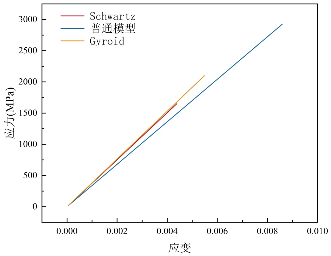 选取对应点的应力、应变,分别取X位置的数据。在普通实体结构模型中,应力σ1 = 760.721 MPa,应变ε1 = 0.002333,计算得弹性模量E = 326 GPa;在Schwartz结构模型中,应力σ2 = 767.351 MPa,应变ε2 = 0.002365,计算得弹性模量E = 324 GPa;在Gyroid结构模型中,应力σ1 = 3991.751 MPa应变ε1 = 0.012511,计算得弹性模量E = 319 GPa。
