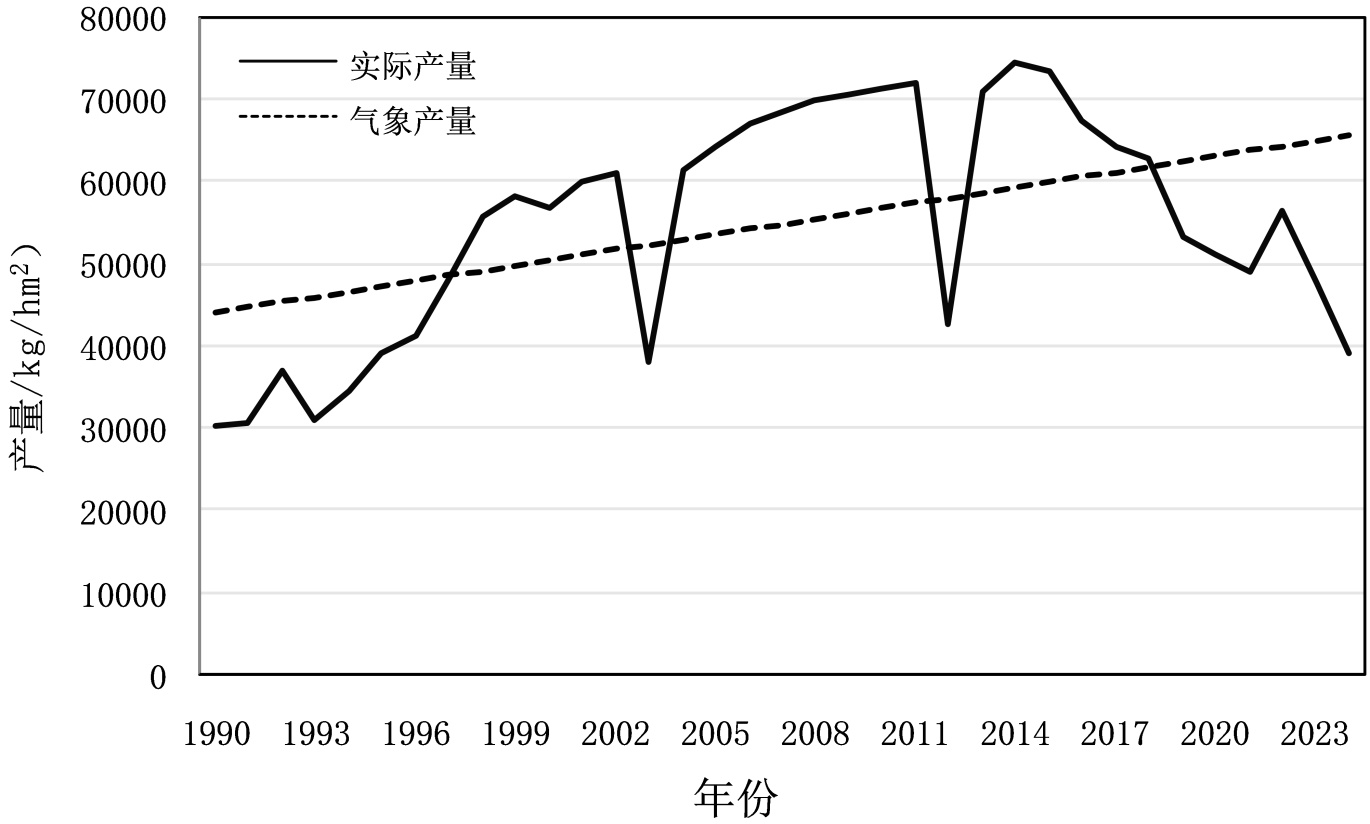 图1. 六枝1990~2023年水稻趋势产量和实际产量模拟曲线图