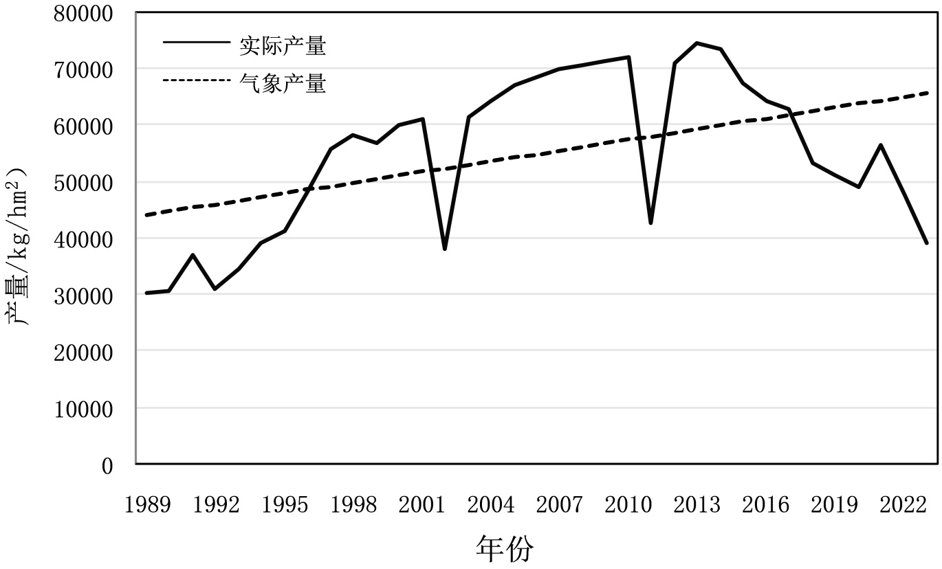 ,求出相对气象产量Xmr。相对气象产量Xmr < −5%为水稻产量减产年,Xmr > 5%为水稻产量丰收年,−5% < Xmr < 5%为水稻产量平年。
