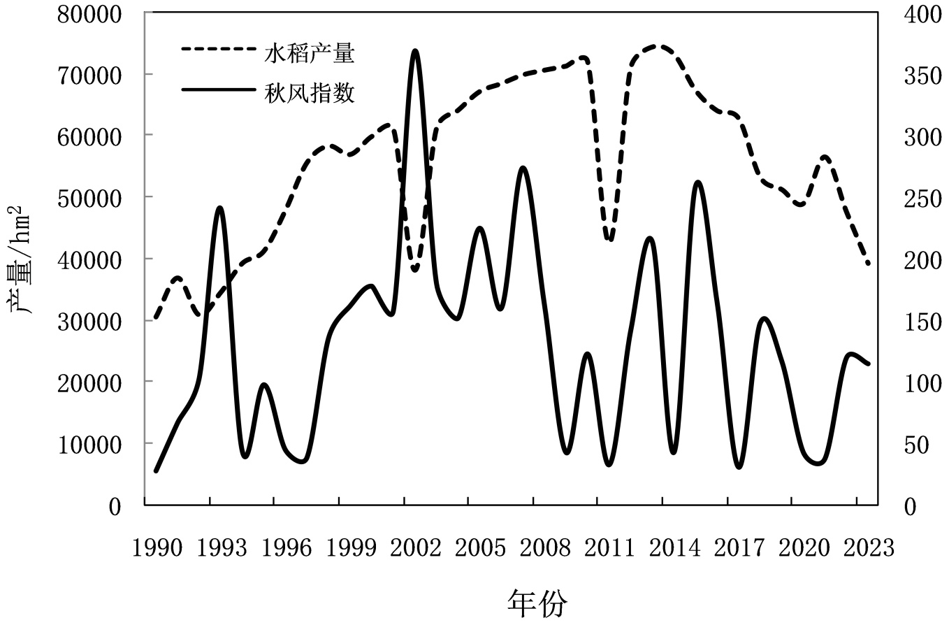 图2. 1990~2023年的水稻产量和六枝秋风强度的变化