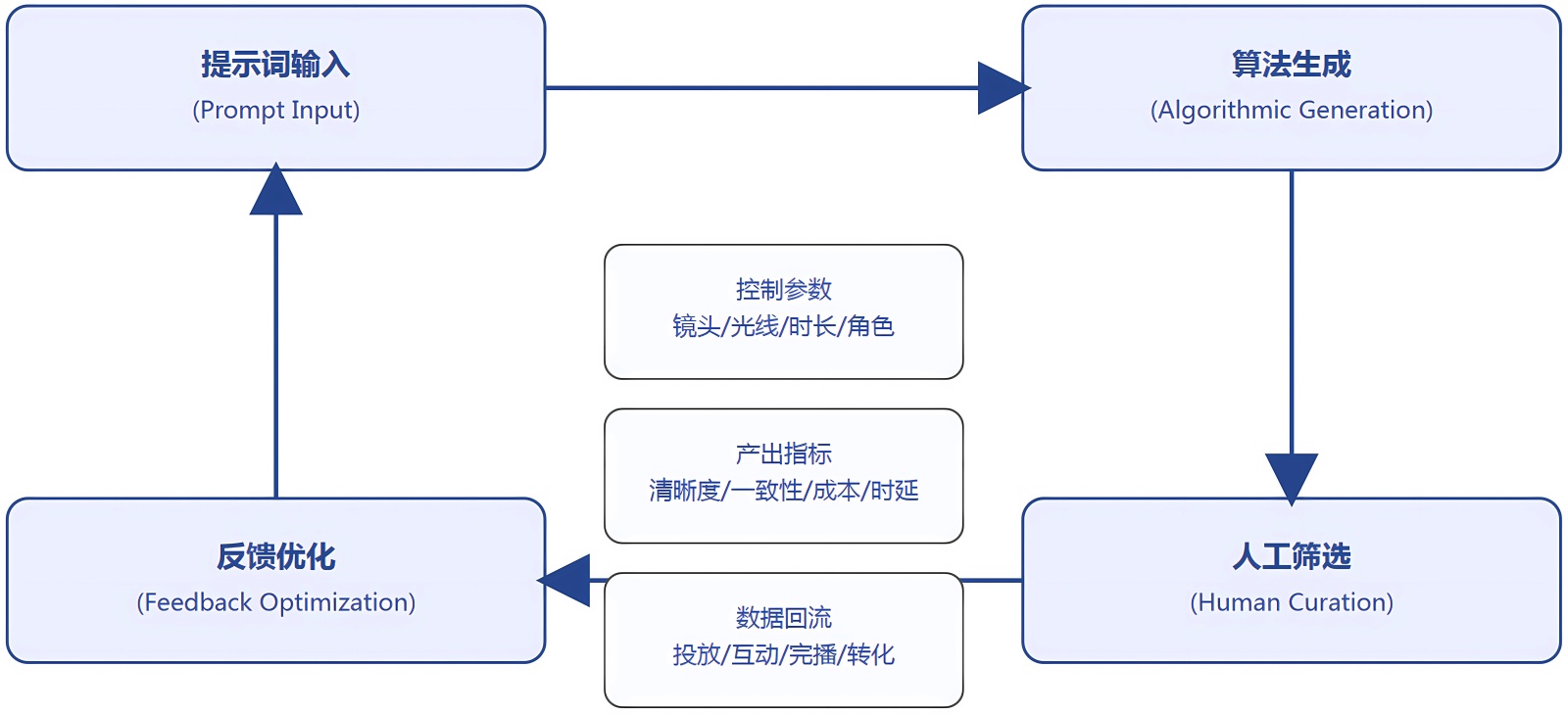 AIGC技术的深度渗透触发了视觉生产逻辑的根本转变。从技术哲学与设计学视角审视,这一过程本质上是影像生产从“拍摄逻辑”向“生成逻辑”的范式革命。牛建国(2023)的研究表明,生成式设计作为一种通用性技术,其核心效能在于显著降低了商业传播中的“信息摩擦”(Information Friction)与边际成本,引发了传播率的“效率革命”[1]。孙守迁(2024)进一步阐述,AIGC通过“预训练 + 指令微调 + 人类反馈”的训练范式,实现了内容生成的快速高效,使设计活动的重心从重复性劳动转向“智能设计”与“人机融合”的新动能[2]。
