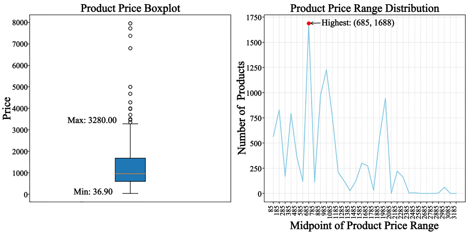 使用Pycharm运行scrapy框架,以助听器为关键词,共爬取到评论数据45,916条,涵盖309个商品。使用Jupyternotebook进行数据的统计性分析并绘制图1,价格和毛重存在离群值,且呈非正态分布。鉴于产品存在迭代、评论有时效性,本研究选取2023年9月至2024年3月的数据,共11,263条;为保证数据的可靠性,剔除图1所示价格、毛重中包含离群值的样本,并删除无效评论;同时,为保证数据的针对性,选取产品适用人群为重度听损者的样本。最后留存5281条评论文本。