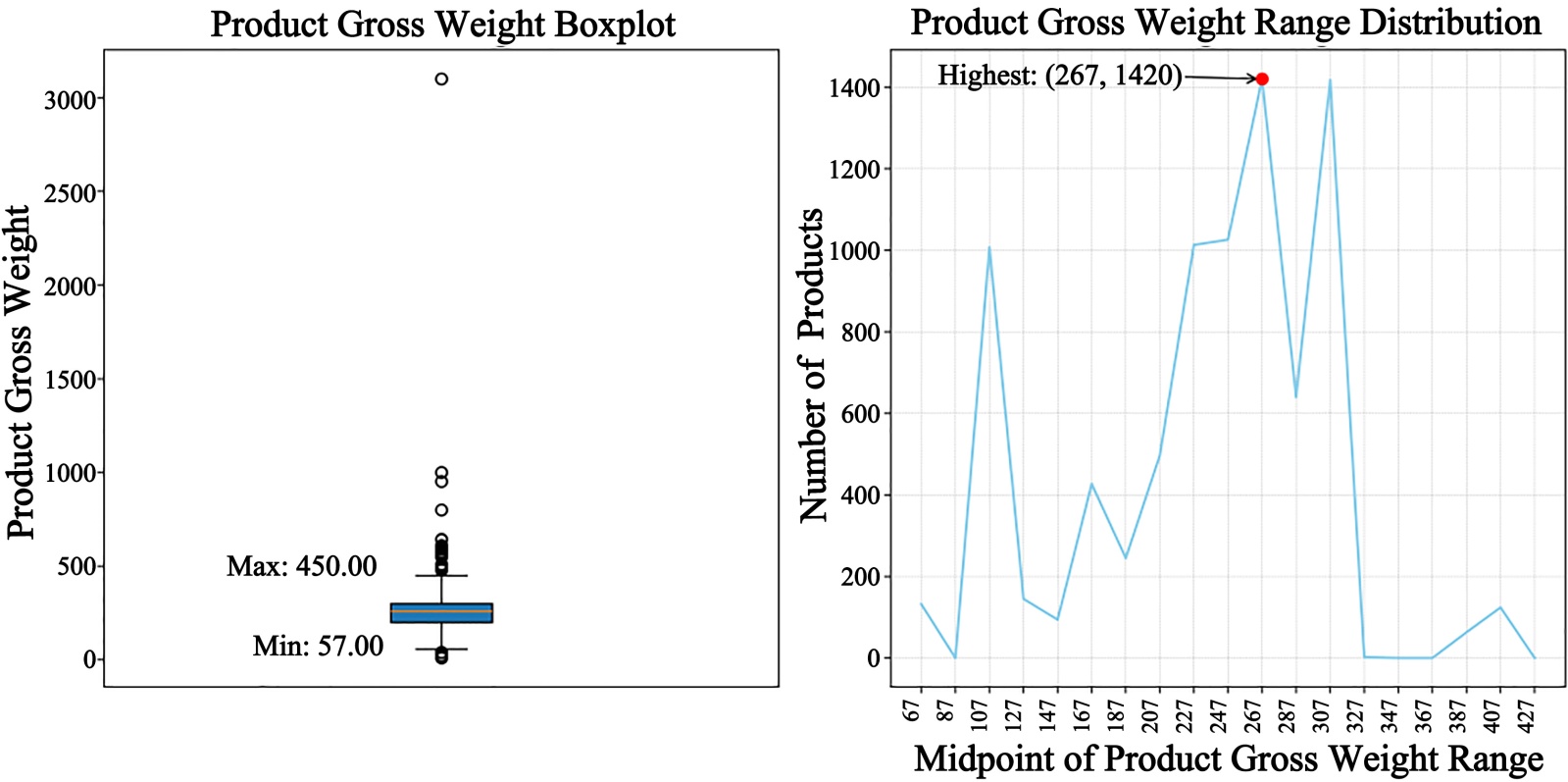 Figure 1. Box chart and distribution of hearing aid price and gross weight