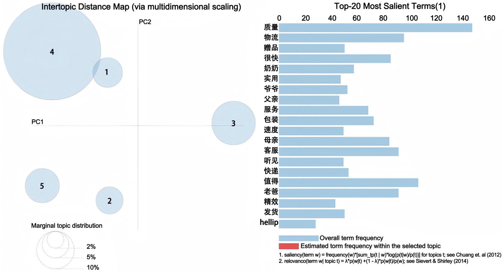 为防止低信息密度高频词对于主题数据的污染,自定义停用词表,内含词汇包括“很好”、“满意”、“不错”等。与此同时,应用了TF-IDF加权方法,进一步减少余下低信息密度高频词的影响。此外,为了提高LDA模型性能,定义了同义词表,并对出现次数小于15次的低频词以及出现比例大于0.7的高频词进行过滤,且最终仅考虑信息量最大的500个词汇。比对LDA模型在1~10个主题下的一致性和困惑度后,发现LDA模型在主题数为5时主题内词汇的一致性最高,达到了0.5390;与此同时困惑度较低,为72.01,因此最终确定主题数为5个。使用pyLDAvis模块,绘制聚类结果如图2所示。用户需求主要侧重主题4,该主题最关注产品本身性能;且主题1与主题4产生部分交叉,主题1更关注产品的快递与物流,由此推测顾客需求往往集中于产品性能及其配送服务方面。