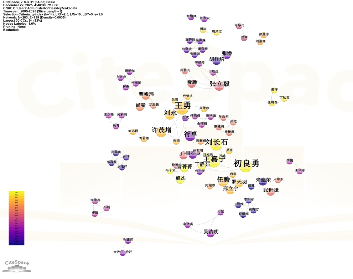 Figure 2. Visualization analysis of author collaboration networks in academic literature from 2005 to 2025