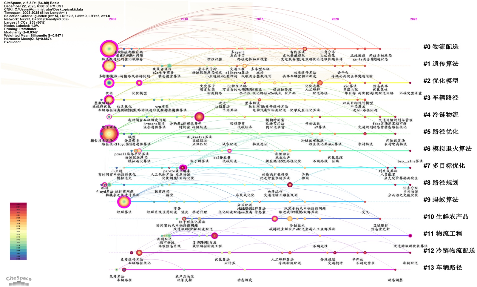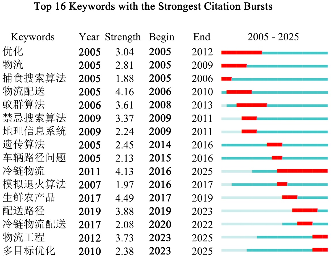 在研究热点演进方面,领域发展与技术迭代、产业需求升级高度同步,呈现出清晰的阶段性演进规律。2005~2012年为基础算法探索期,遗传算法(突现强度2.45)、蚁群算法(突现强度3.61)、模拟退火算法(突现强度1.97)等元启发式算法成为研究核心,聚焦为复杂路径优化问题提供高效求解工具,奠定了领域技术基础;2013~2017年为场景需求驱动期,车辆路径问题(突现强度2.13)、冷链物流(突现强度4.13)等关键词相继突现,研究从算法理论向实际问题延伸,开始融入场景约束条件;2018~2025年为技术深化与应用落地期,生鲜农产品(突现强度4.49)、物流工程(突现强度3.73)、多目标优化(突现强度2.38)等成为核心热点,研究从单一成本最优转向多维度目标协同,且愈发注重理论向工程实践的转化,形成了“算法 + 数据 + 场景 + 可持续”四位一体的发展趋势。