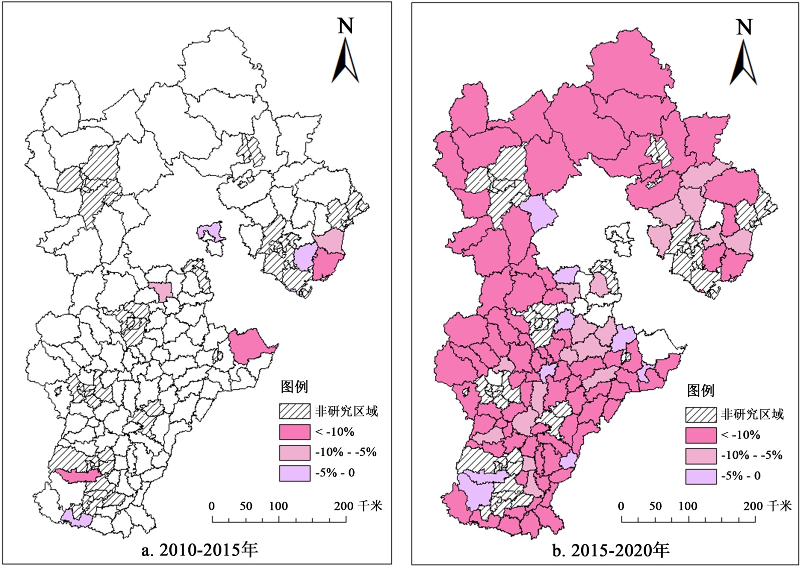 分别表示2010~2015年和2015~2020年两个时期的常住人口变化率。