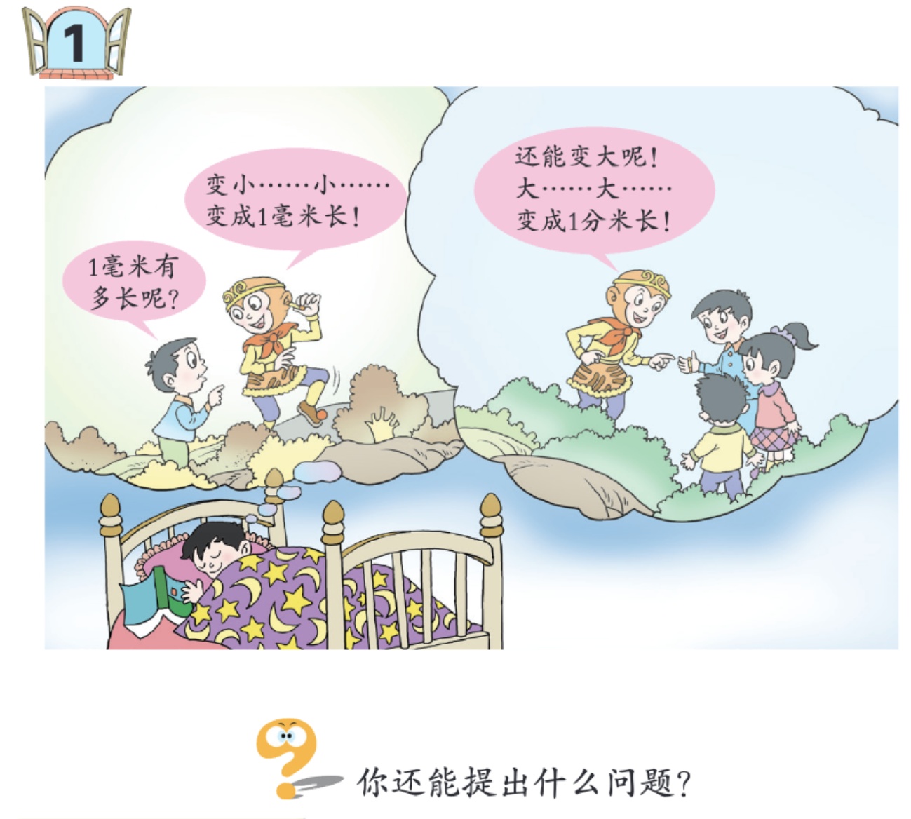 如图1所示:教材P34页设计了“梦境中孙悟空金箍棒的长度”问题情境,此情境选材为学生熟悉且喜爱的孙悟空形象,利于抓住学生的眼球,使学生迅速进入课堂状态。同时孙悟空在梦境中说道“金箍棒能变成1毫米长,能变成1分米长!”,可以成功激发起学生主动学习“1毫米和1分米有多长”的欲望。