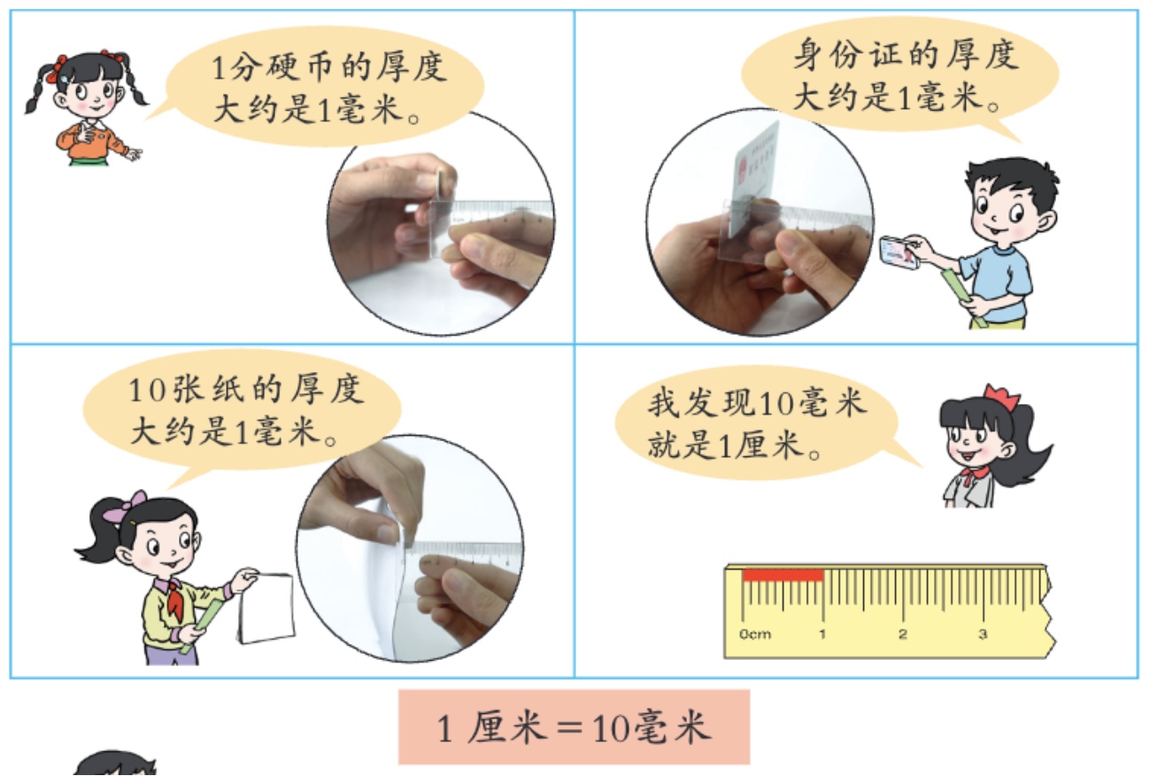 生(手持硬币):老师,我摸不出来1毫米有多厚,怎么办?