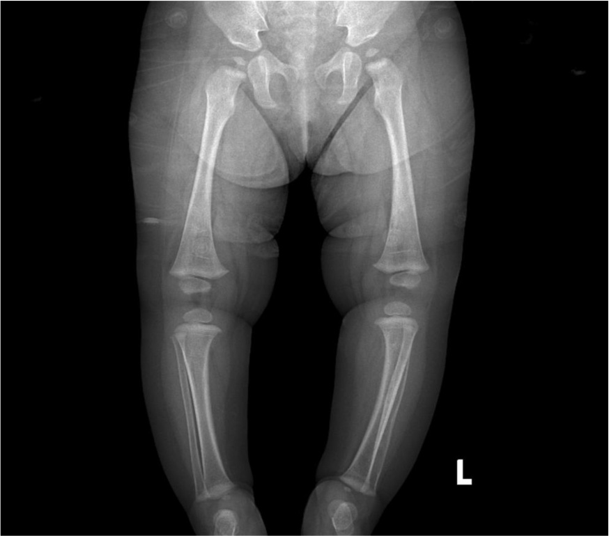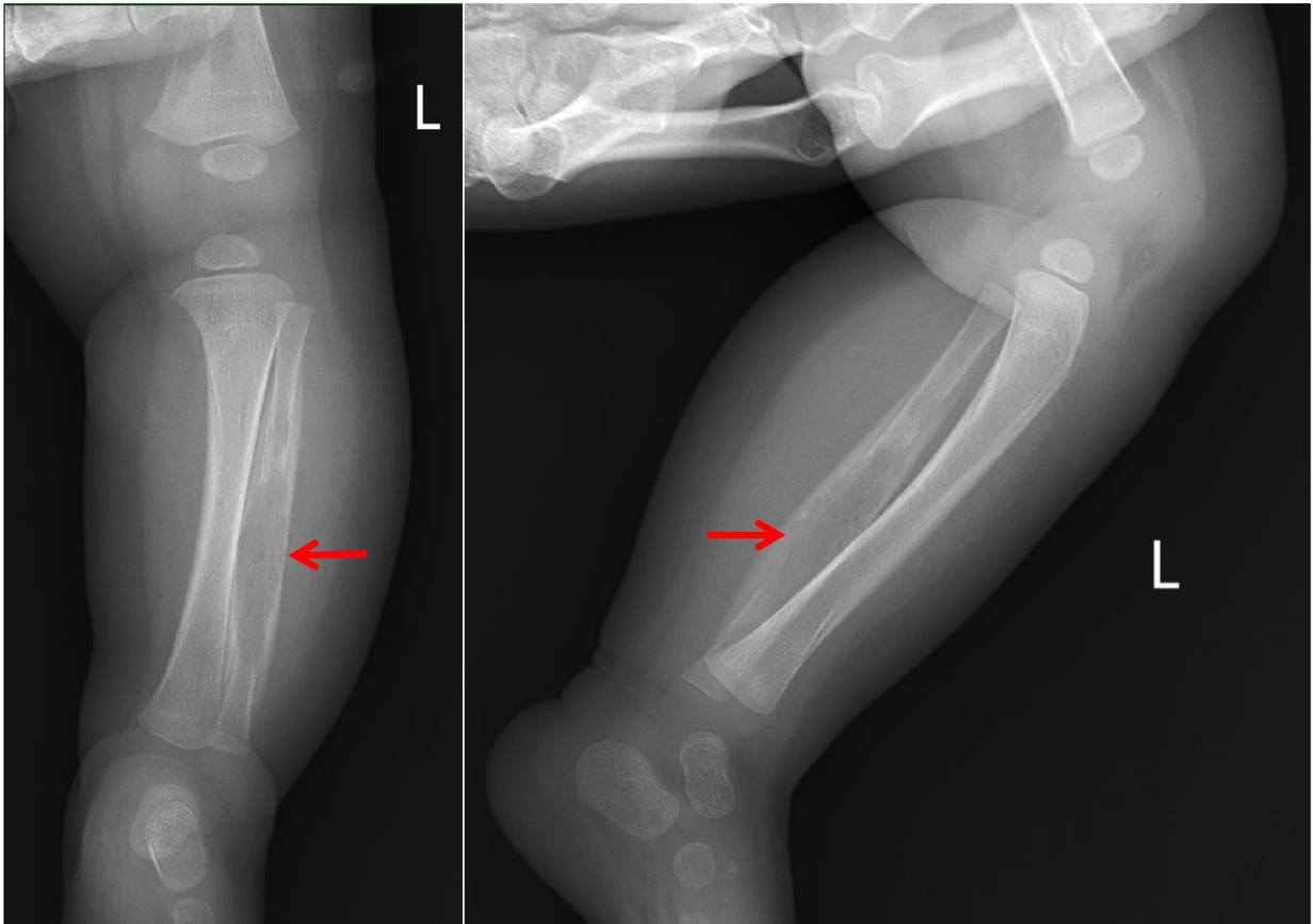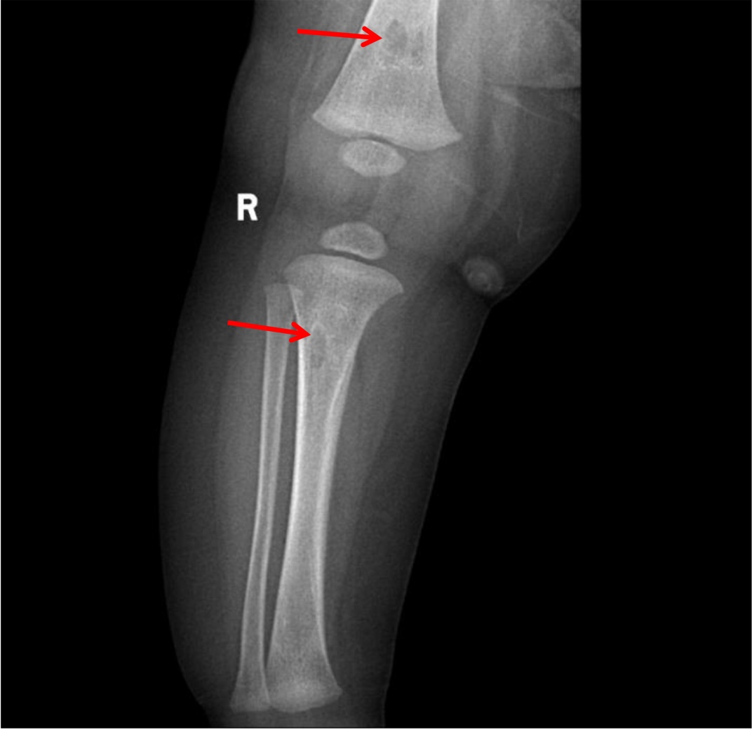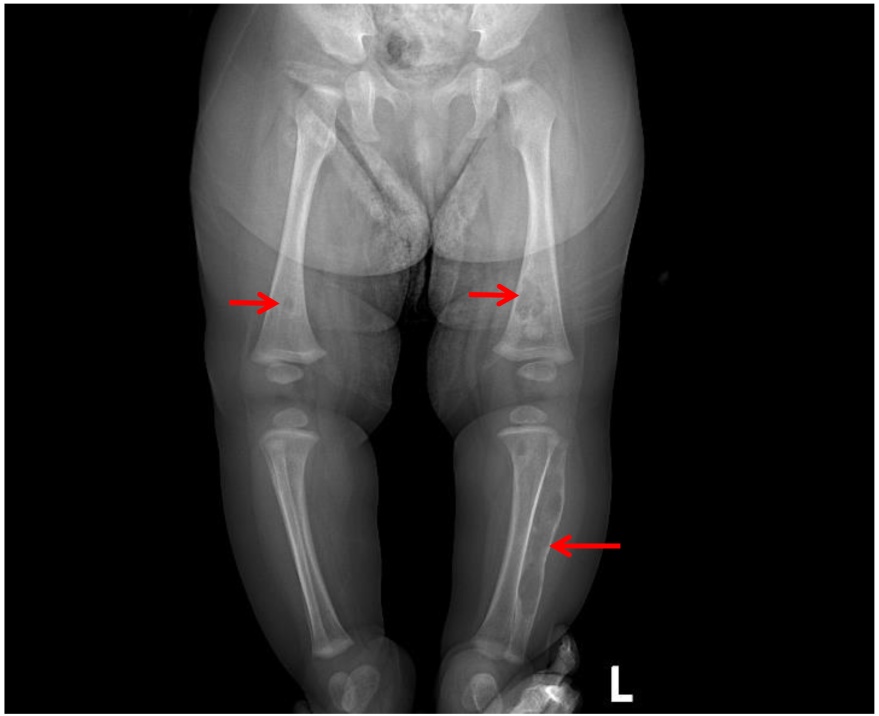 左侧股骨下段、右侧股骨下段、左胫腓骨内部见多发骨质密度减低区,左腓骨髓腔不规则长段囊腔样扩大、皮质变薄、层状骨膜恢复。