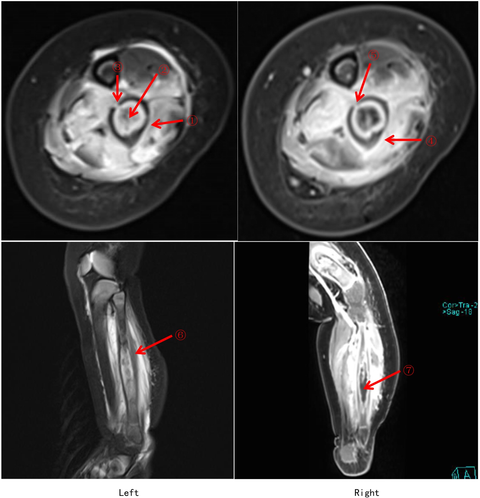 图2. 左侧胫腓骨磁共振(左图:平扫,右图:增强)
