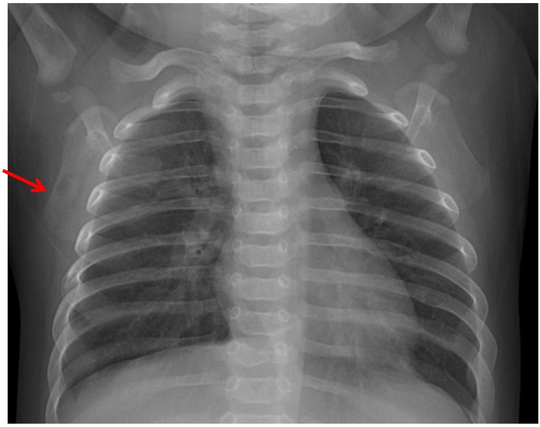 (1) 病史:患儿,女,3月17天,因“发热6天,左下肢肿胀4天”于2025-09-09入院。患儿于2025年9月3日无明显诱因出现发热,最高温度达38.3℃,无寒战、抽搐,可自行降至正常,但易复升,热峰约2~3次天,伴偶尔干咳,单声咳,无流涕,无呕吐、腹泻等不适。当日前往当地医院就诊,给予“小儿豉翘清热颗粒”“阿莫西林克拉维酸干混悬剂”口服2天,无明显好转。9月5日晚发现患儿下肢出现明显肿胀,轻捏左下肢患儿有哭闹,9月6日前往当地医院住院,考虑急性骨髓炎,完善相关检查,给予头孢他啶抗感染治疗,疗效欠佳,患儿仍有反复发热,左下肢肿胀无缓解,9月9日为求进一步诊治来我院就诊,急诊以发热、下肢肿胀查因收入我科。