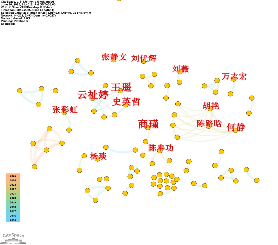 基于CiteSpace构建的作者合作网络图谱如图2所示,其中节点对应作者,节点标签尺寸表示其发文频次,节点间连线指示合作共现关系。发文量排名前五的高产作者分别是云祉婷、商瑾、王遥、何静、史英哲,其中云祉婷、王遥和史英哲合作关系稳定,研究成果较丰硕。如图2所示,N (节点) = 262个,E (连线) = 93个,Density (密度) = 0.0027。连线少于节点,密度较小。研究表明,该时期作者合作关系呈离散态分布。研究者大部分以自我研究为中心,研究节点普遍分散,该领域内学者间合作紧密程度仍有较大上升空间。