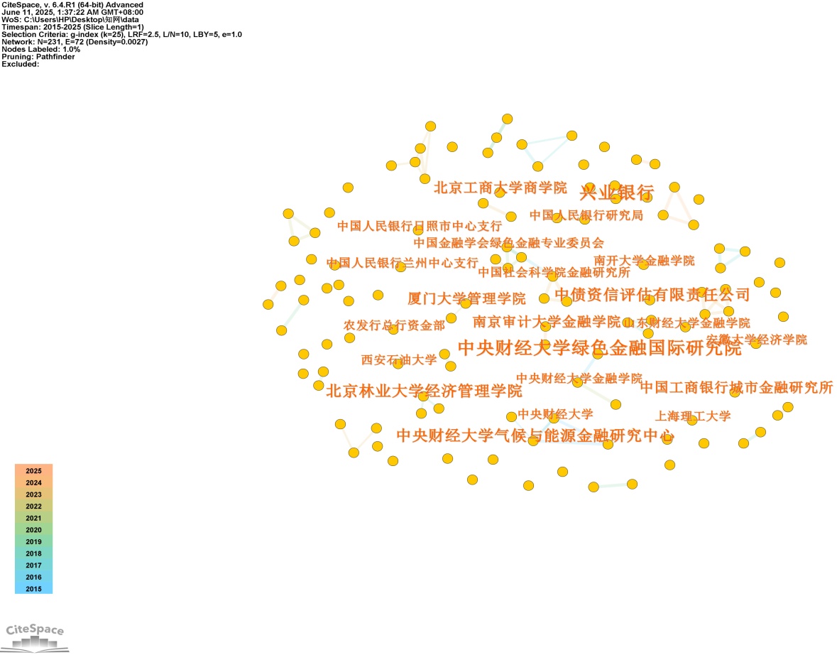 本文利用CiteSpace软件绘制得到机构合作网络图谱如图3所示,图谱中N (节点) = 231个,E (连线) = 72,Density (密度) = 0.0027。图谱结构显示节点空间分布离散且连接稀疏,表明机构合作呈现局部化特征,研究活动主要集中于内部体系,尚未形成广域协作网络,跨机构协作仅以零星小规模形态存在。发文总量排名前五的机构分别是兴业银行、中央财经大学绿色金融国际研究院、北京林业大学经济管理学院、中债资信评估有限公司、中央财经大学气候与能源金融研究中心。其中兴业银行和中央财经大学绿色金融国际研究院发文数量为7篇,研究成果较多且对发行绿色债券研究时间较早。此外,大研究机构分布高度集中于经济管理院系及商业银行,表明绿色债券研究主要由经济学科学者驱动。