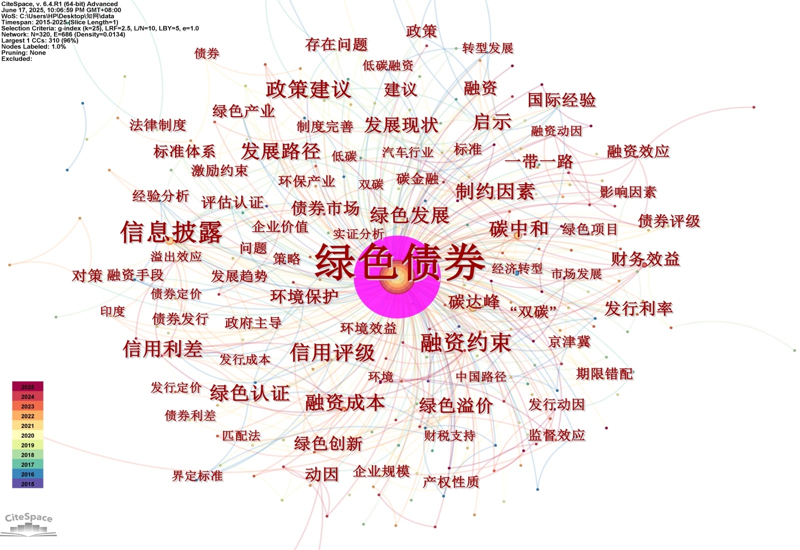 本文研究样本文献来源于中国知网(CNKI)数据库,通过中国知网中高级检索功能设定检索条件进行文献检索,检索时间为2025年6月10日,来源类别选定“全部期刊”,将主题词设定为“发行绿色债券”。对检索文献进行人工筛选后共获取575篇期刊文献篇,文献时间范围设定为2015年1月至2025年6月。本研究以575篇文献为样本,经由CNKI平台导出reworks格式数据,导入CiteSpace软件实施文献计量分析。