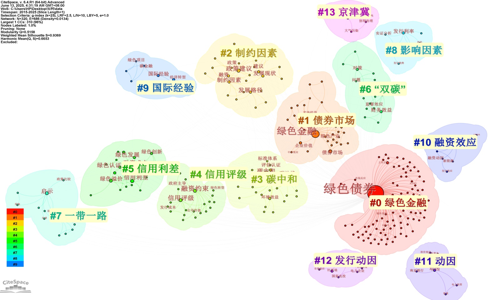 本研究采用CiteSpace的LLR聚类算法,对绿色债券领域关键词实施聚类分析,计算生成聚类模块化评估指标(Q值)为0.5158,平均轮廓值(S值)为0.9369,一般认为Q值 > 0.3时,聚类结构显著;S值 > 0.5时聚类结果合理,图5的数值均高于常规判定标准,表明得到的聚类标签能够科学准确地反映发行绿色债券领域关键词的聚类情况。