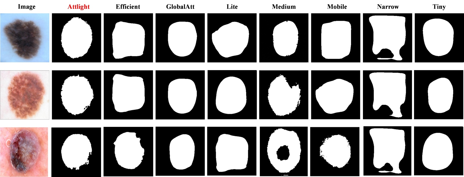 表2、表3显示,MALUNetGlobalAtt均获得了在ISIC2017数据集上的归一化蒸馏训练获得了最低的总损失值,接下来在我们将上述八种模型量化部署至RK3588开发板,并进行单样本推理,并与原始MALUNet模型在PC端的测试结果做对比。