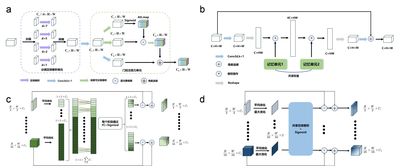 基于此本文引入DGA模块[8],通过融合空洞卷积与门控注意力机制,实现对全局信息与局部信息的特征提取。如图2(a),本模块由两个单元组成,分离空洞卷积单元首先利用不同膨胀率的卷积操作对特征图进行处理,使网络能够同时捕获大尺度结构信息和小尺度细节特征。而门控注意力单元对提取到的特征进行自适应调制,使模型能够抑制冗余信息并强化对目标区域的关注。IEA是在外部注意力机制的基础上引入倒置结构设计的一种改进模块[8] [9],如图2(b),能够实现在保持全局建模能力并进一步降低计算复杂度,增强特征表达的稳定性。如图2(c),CAB用于在通道维度上实现多阶段特征的信息交互与有效融合。CAB将各阶段特征首先通过全局信息提取操作进行压缩[8],然后不同阶段的通道特征在通道维度上进行融合,并通过轻量化的映射生成对应的通道注意力权重。最后使得模型能够识别哪个阶段的拓展通道是重要的。而SAB用于在特征融合过程中学习空间位置之间的依赖关系[8],如图2(d),以增强关键区域的表达能力。