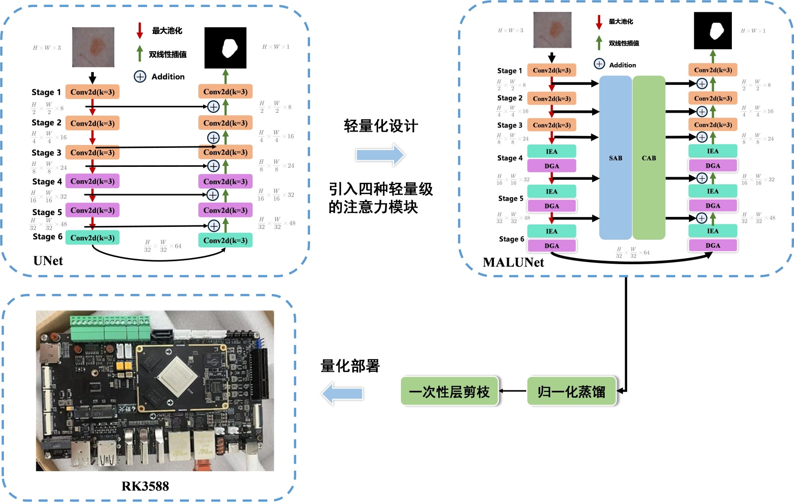 本文针对医学影像分割模型在边缘设备上难以兼顾精度与实时性的问题,设计了轻量化网络MALUNet,并基于国产瑞芯微RK3588平台完成了全流程量化部署。研究通过引入空洞门控、反转外部注意力及特征桥接模块优化网络结构,并结合归一化知识蒸馏与一次性层剪枝策略,有效解决了复杂模型在受限算力下的运行瓶颈。在ISIC2017数据集上的实验结果表明,本文提出的轻量化MALUNetGlobalAtt综合性能最优,在保持较高分割精度(mIoU 0.8126)的同时,相比原始模型推理时间降低了96%,成功实现了在RK3588 NPU上的毫秒级高效运行。本文提出的软硬协同优化方案验证了深度医学影像算法在国产边缘计算平台落地的工程可行性,为智慧医疗的端侧应用提供了具有实用价值的技术参考。