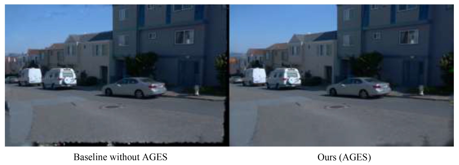 表5对我们框架中的核心组件进行了系统性的评估。在Waymo数据集上,基线模型(不包含AGAR与DSR)取得了PSNR = 35.82、SSIM = 0.958、LPIPS = 0.090的结果。仅引入AGAR后,各项指标均得到稳定提升(PSNR = 35.91、SSIM = 0.961、LPIPS = 0.086),表明外观与几何之间的交互式更新能够显著提升重建质量。在此基础上进一步加入DSR后,性能继续提升至PSNR = 36.00、SSIM = 0.962、LPIPS = 0.084,说明该正则项通过强化局部几何一致性提供了互补性的收益。图7给出的可视化消融结果直观展示了这些逐步改进。基线模型在几何边界处存在明显噪声;引入AGAR后,外观与几何之间增强的信息流有效抑制了这些伪影;进一步加入DSR则使边界更加锐利,表面结构更加连贯一致。综合来看,这些结果验证了联合优化外观建模与几何一致性对于获得高质量三维重建至关重要。